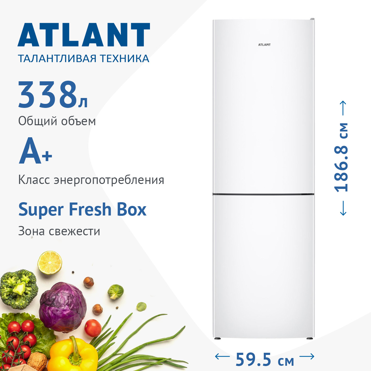 Описаниехолодильник-морозильник отдельностоящий 186,8x59,5x62,9см,белый,2-камерный,нижн.мороз-3ящика,1компрессор,338л,класс А+,серия ADVANCED + зона свежести.