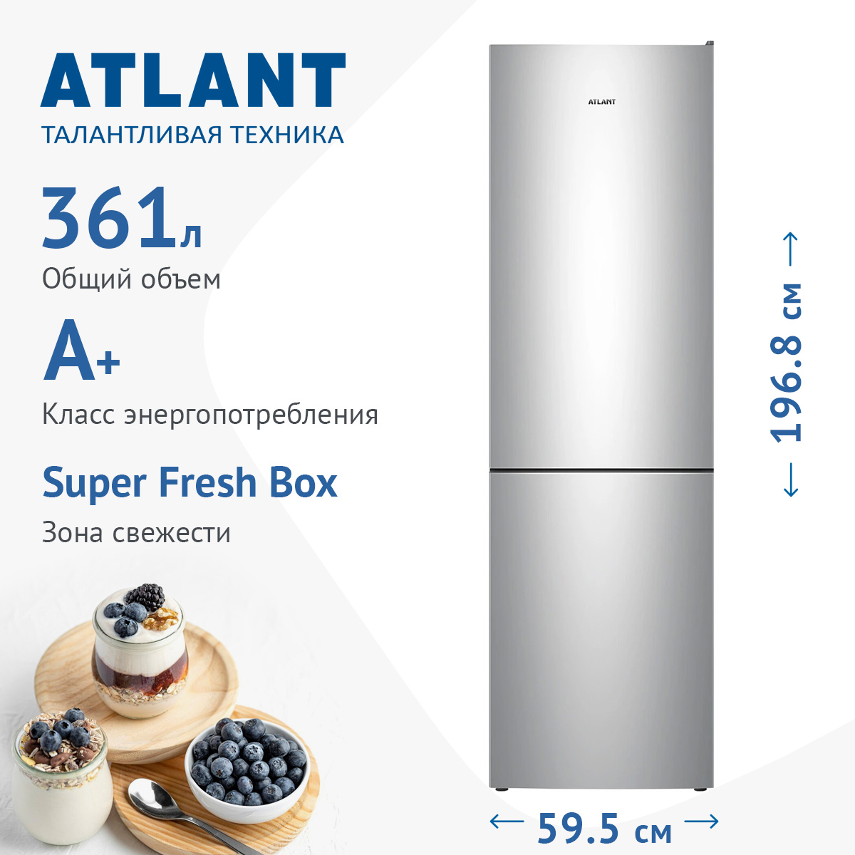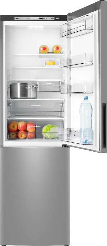 Описаниехолодильник-морозильник отдельностоящий 196,8x59,5x62,9см,серебристый,2-камерный,нижн.мороз-3ящика,1компрессор,361л,класс А+,серия ADVANCED + зона свежести.