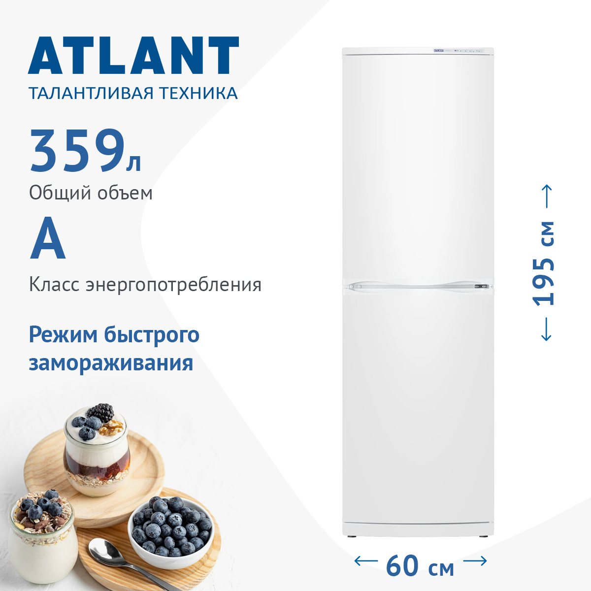 Описаниехолодильник-морозильник, 359 л, класс энергопотребления А, 60x63x195 см, белый