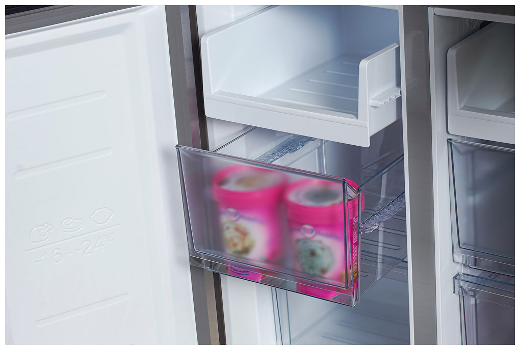 Описаниехолодильник-морозильник Side-by-Side отдельностоящий, 456 л, класс энергопотребления А+, No Frost, 83,3х65,5х178 см, нержавеющая сталь