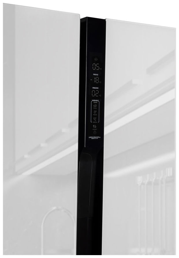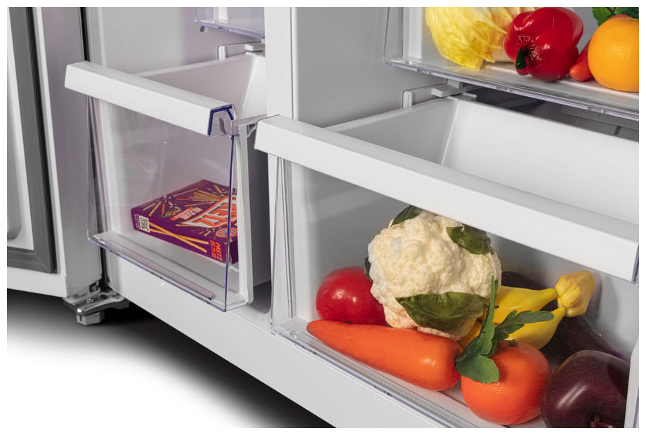 Описаниехолодильник-морозильник Side-by-Side отдельностоящий, 552 л, класс энергопотребления А+, No Frost, 91,1х65,6х183 см, белое стекло