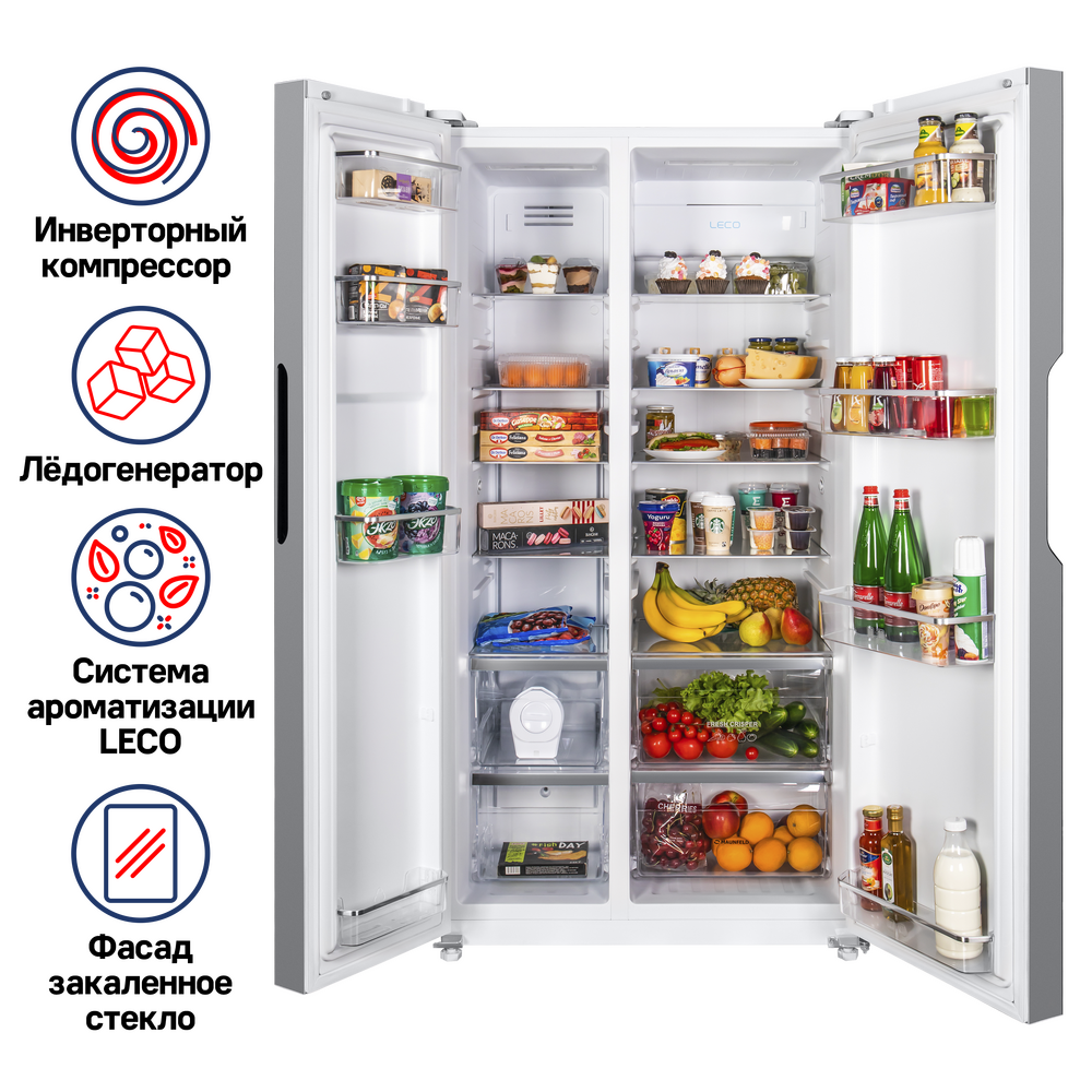 Описаниехолодильник-морозильник Side-by-Side отдельностоящий, 562 л, класс энергопотребления А+, NoFrost, 91,2х70,4х177 см, белое стекло