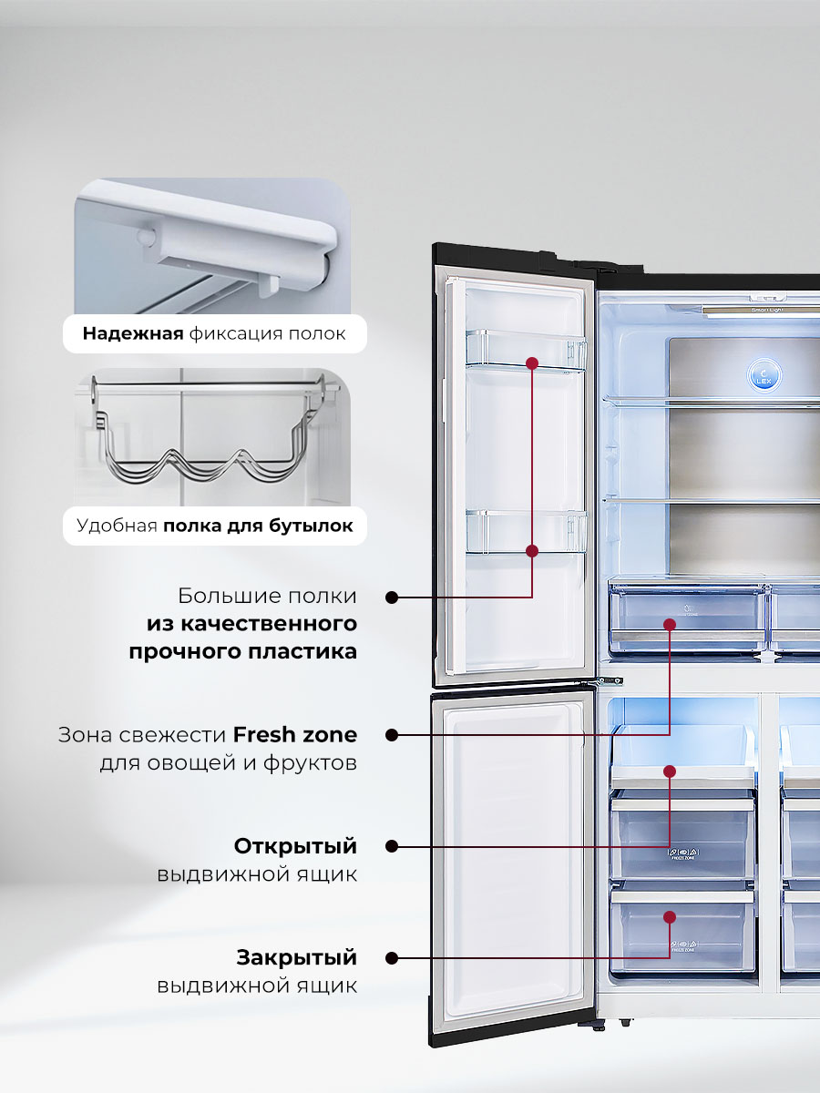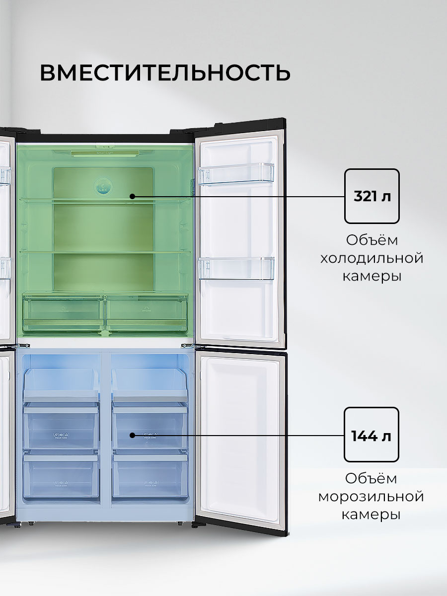 Возможность перевешивания двери нет Количество дверей 4 Количество камер 3 Мощность замораживания до 12 кг/cутки Общий объем 465 л Объем морозильной камеры 144 л Размер (Высота) 183 см Размер (Глубина) 63,6 см Размер (Ширина) 91,1 см Размораживание морозильной камеры No Frost Тип установки отдельностоящий Цвет черный Класс энергопотребления класс A+ Ширина прибора 91 - 121 см Высота прибора 181 - 185 см Управление электронное Гарантийный срок (месяцы) 36,6 Страна производитель Китай Ссылка на сайт производителя https://lex1.ru/shop/holodilniki/side-by-side/lex-lcd505blorid?asp_highlight=CHHE000032&p_asid=1 Максимальный уровень шума 42 дБ Тип холодильник с морозильником Внутреннее освещение есть Зона свежести есть Объем холодильной камеры 321 л Размораживание холодильной камеры No Frost Расположение морозильной камеры снизу Размер в упаковке (Высота) 189,5 см Размер в упаковке (Ширина) 96,8 см Размер в упаковке (Глубина) 68 см Вес прибора 92 кг Тип компрессора инверторный Полка для бутылок есть Количество контейнеров в морозильной камере 4 Размер (Ширина), см 91,1 Размер (Высота), см (Общие) 183 Размер (Глубина), см 63,6 - Отзывы