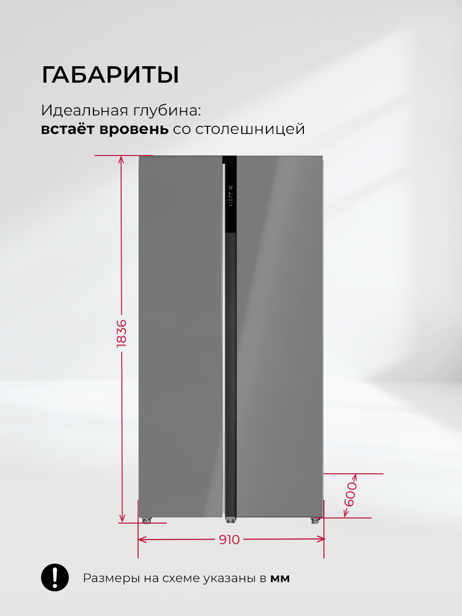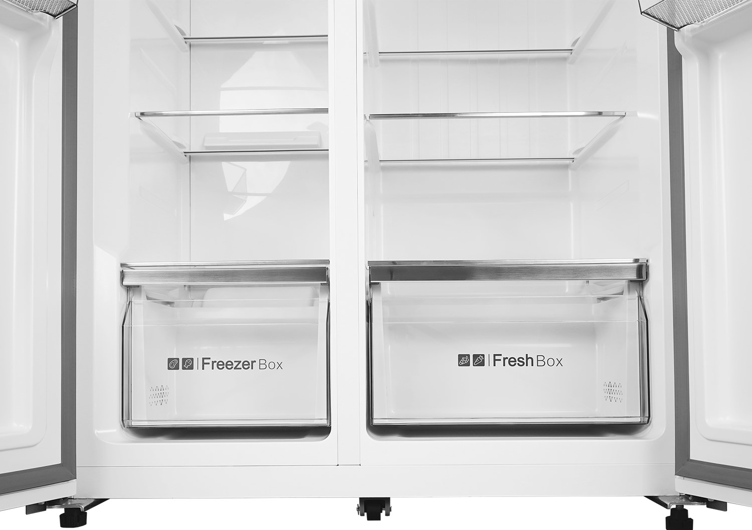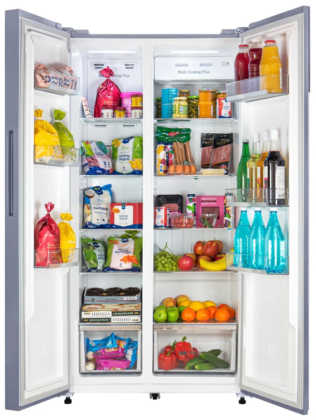 Описаниехолодильник-морозильник Side-by-Side отдельностоящий, 466 л, класс энергопотребления А+,No Frost, 91х60х183,6 см, серебристое стекло