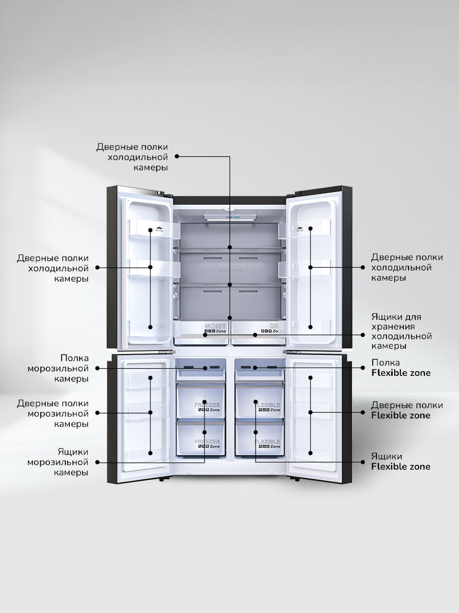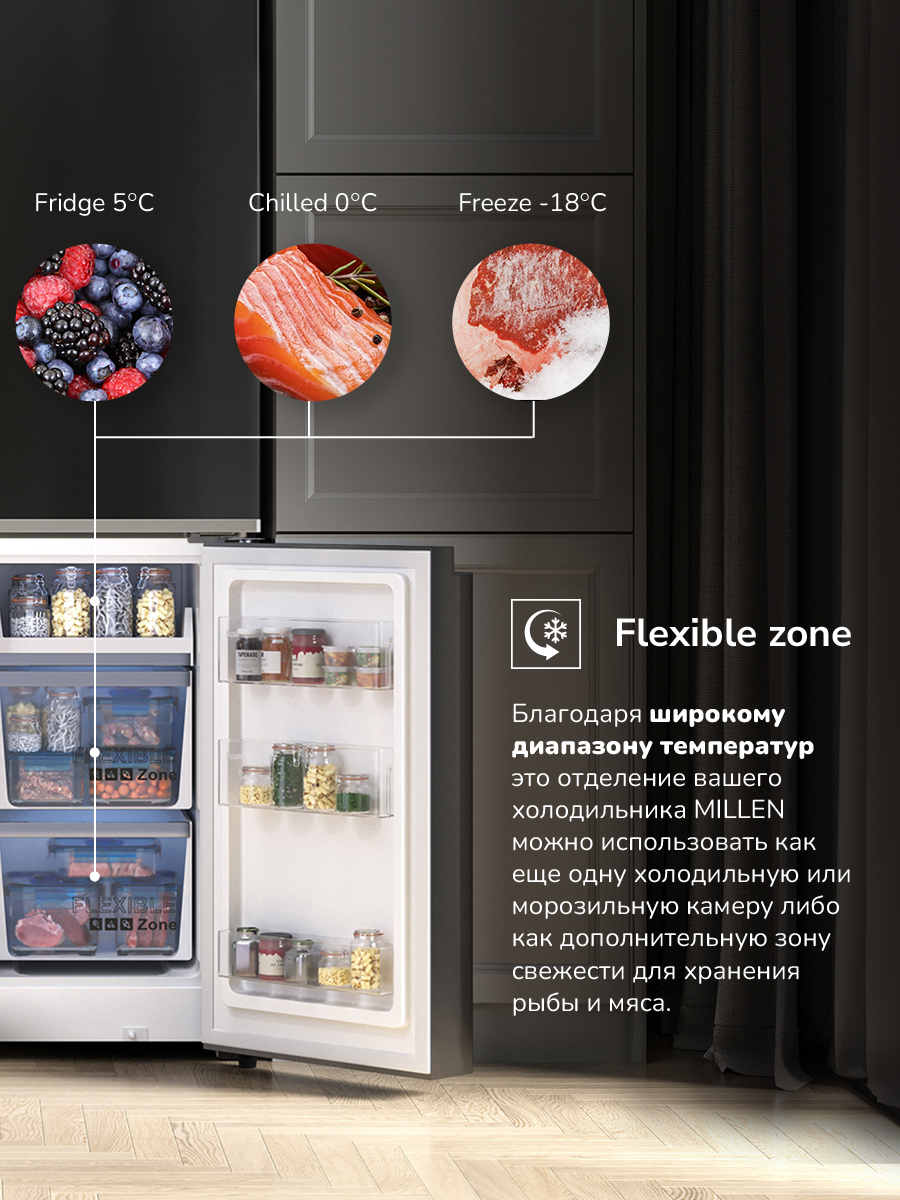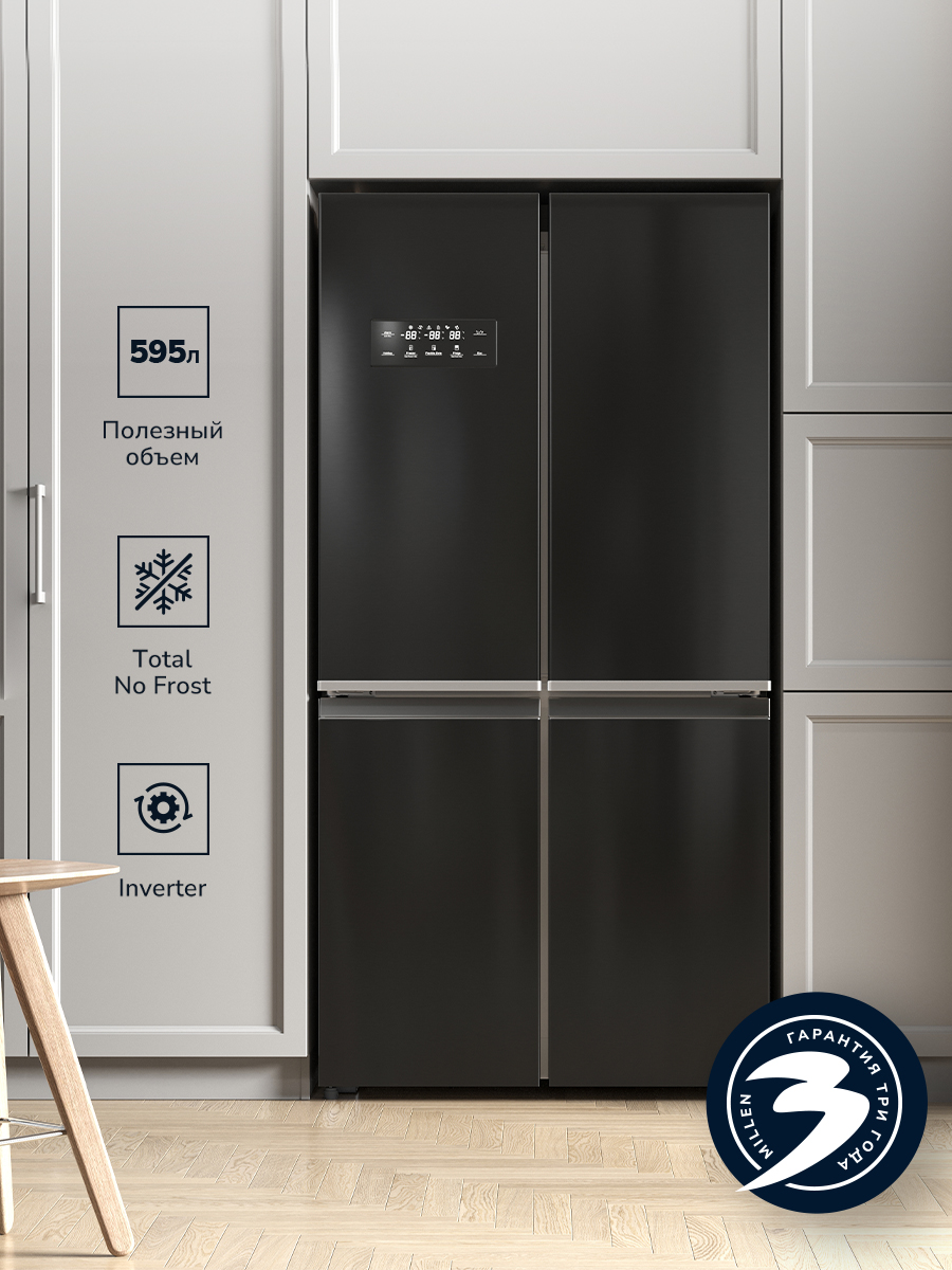 Возможность перевешивания двери нет Количество дверей 4 Количество камер 3 Мощность замораживания до 12 кг/cутки Общий объем 595 л Объем морозильной камеры 105 л Размер (Высота) 182 см Размер (Глубина) 72 см Размер (Ширина) 90,5 см Размораживание морозильной камеры No Frost Тип установки отдельностоящий Цвет черный Класс энергопотребления класс A+ Ширина прибора 81 - 90 см Высота прибора 181 - 185 см Управление электронное Страна производитель Китай Ссылка на сайт производителя https://millen.shop/shop/refrigerators/holodilniki-cross-door/mcd-595bdid/?ysclid=lkwifkghy5536768277 Максимальный уровень шума 42 дБ Тип холодильник с морозильником Внутреннее освещение есть Зона свежести есть Объем холодильной камеры 385 л Размораживание холодильной камеры No Frost Расположение морозильной камеры Side by Side Размер в упаковке (Высота) 78 см Размер в упаковке (Ширина) 192 см Размер в упаковке (Глубина) 97 см Размер (Ширина), см 90,5 Размер (Высота), см (Общие) 182 Размер (Глубина), см 72 - Отзывы