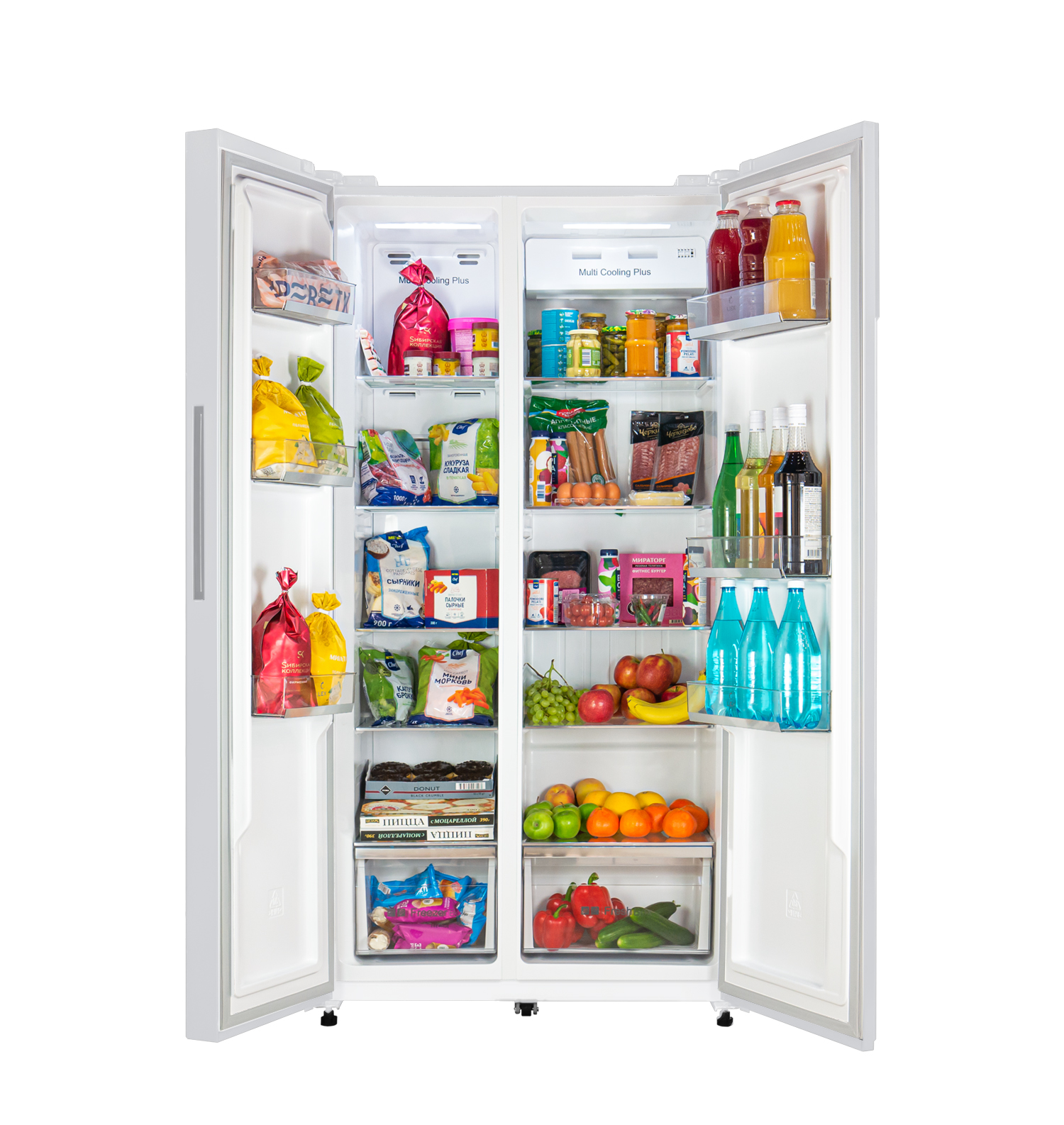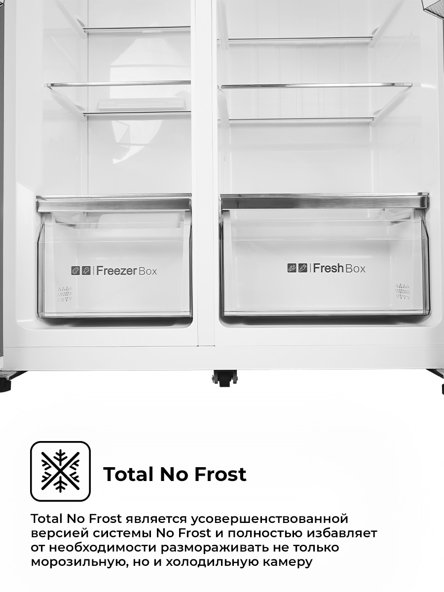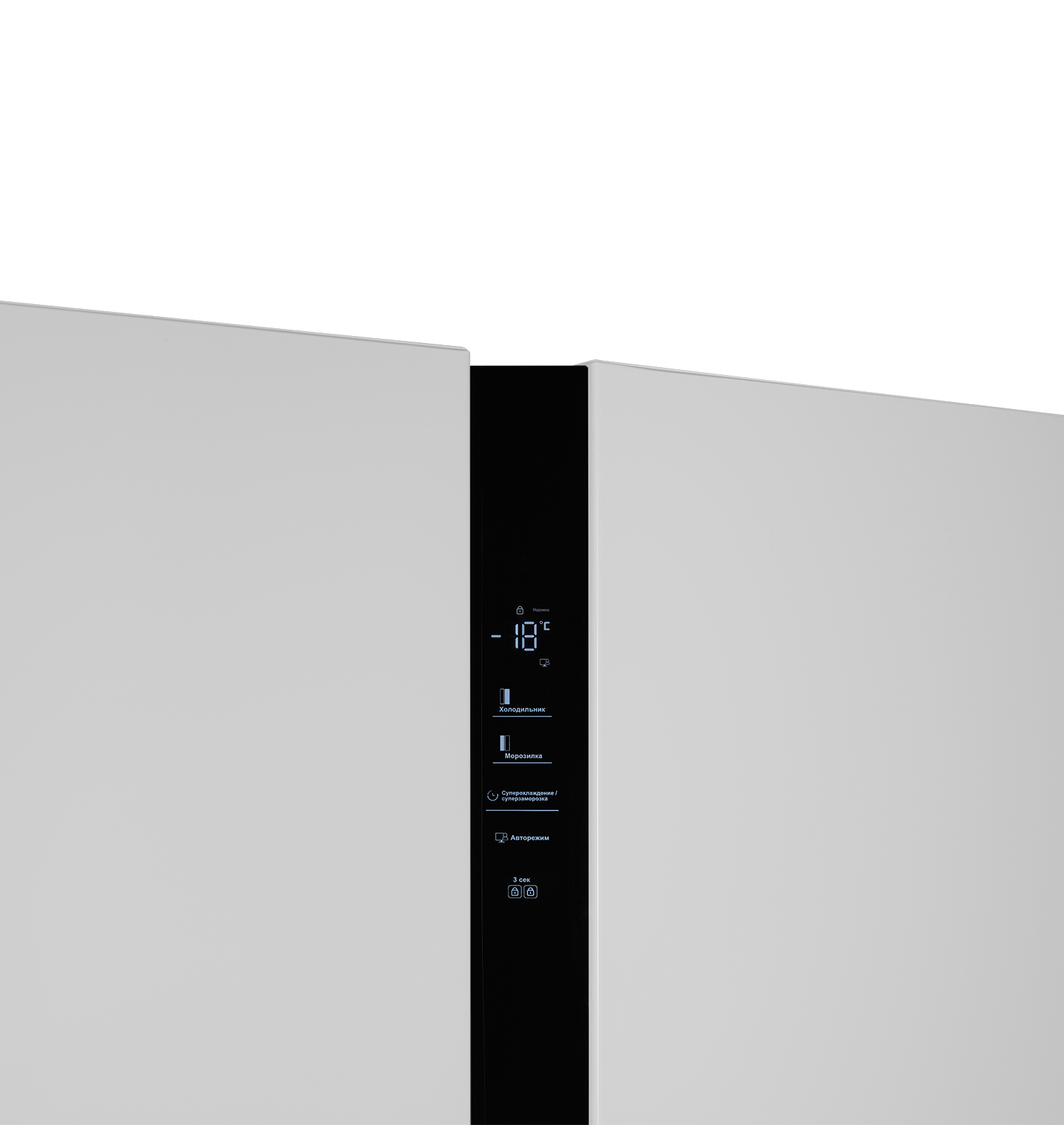 Описаниехолодильник-морозильник Side-by-Side отдельностоящий, 466 л, класс энергопотребления А+, No Frost, 91х60х183,6 см, белый/стекло