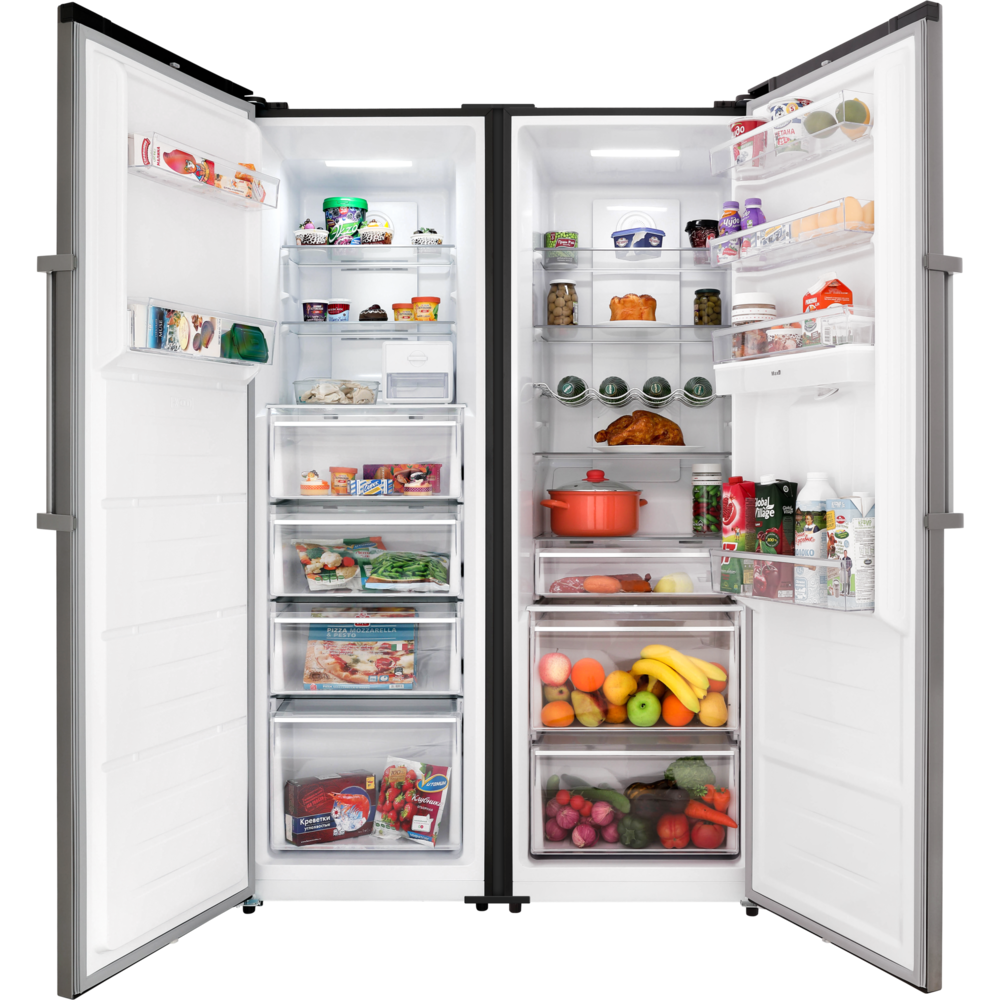Описаниехолодильник-морозильник Side-by-Side отдельностоящий, 614 л, класс энергопотребления А++, No Frost, 119х65х185 см, серебристый