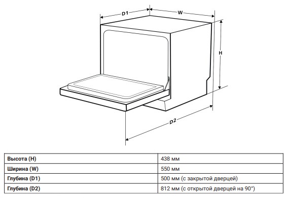 Описаниемашина посудомоечная компактная, 6 комплектов, 55х50х43,8 см, черный