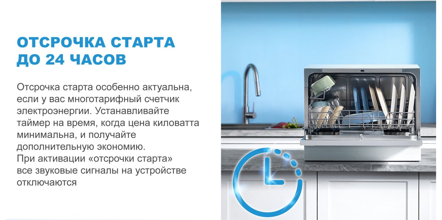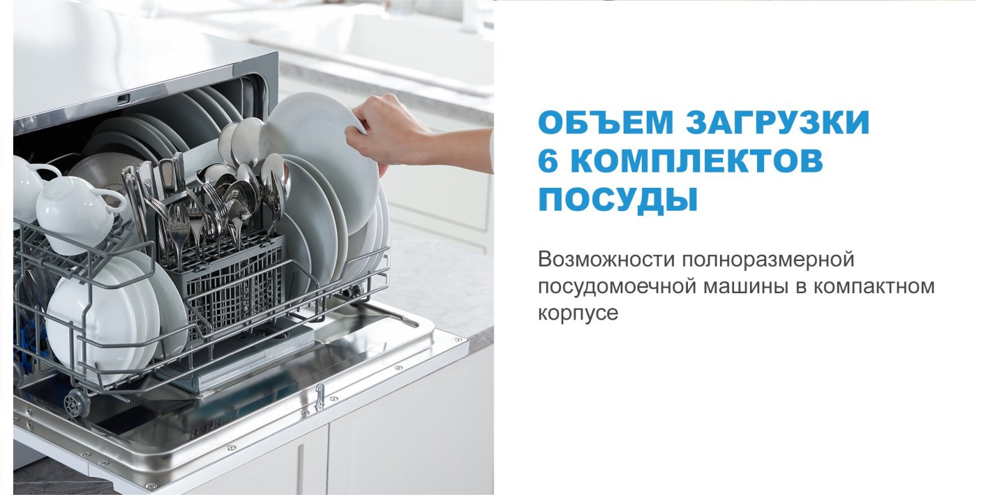Описаниемашина посудомоечная компактная, 6 комплектов, 55x50x43,8 см, серебристый