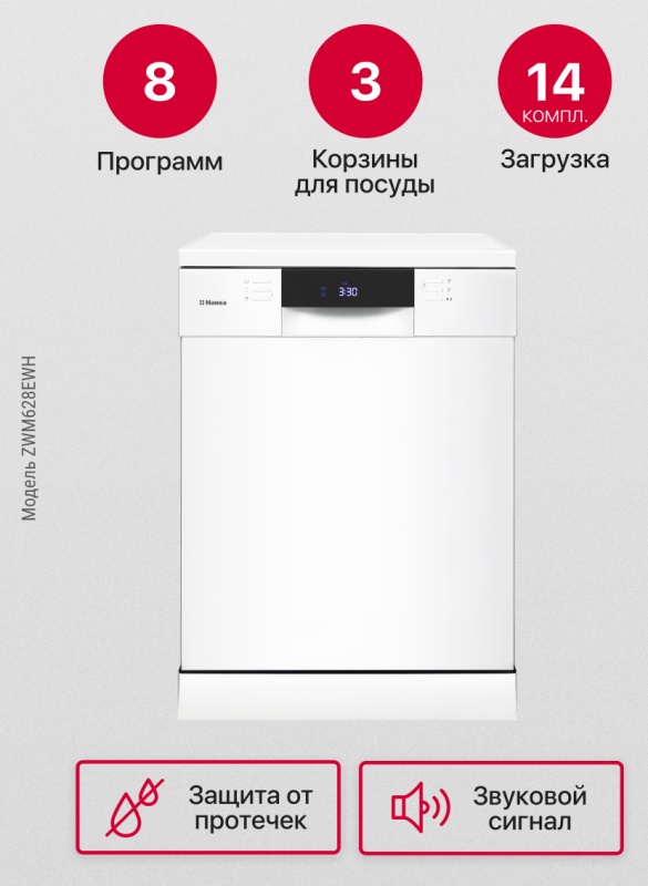 Размер (Высота) 84,5 см Размер (Глубина) 60 см Размер (Ширина) 59,8 см Тип установки отдельностоящий Цвет белый Класс энергопотребления класс A++ Управление электронное Защита от детей нет Гарантийный срок (месяцы) 12 Страна производитель Китай Ссылка на сайт производителя https://www.hansa.ru/catalog/posudomoechnye_mashiny/zwm628ewh/?ysclid=ldk3r1jxh1739765063 Максимальный уровень шума 44 дБ Вместимость 14 комплектов Защита от протечек есть Звуковой сигнал есть Индикатор "Луч на полу" нет Использование средств 3 в 1 нет Количество программ 6 Сушка посуды конденсационная Тип полноразмерная Отложенный старт, ч 1 - 24 Режим половинной загрузки нет Количество корзин 3 Автооткрывание дверцы нет Внутреннее освещение есть Размер в упаковке (Высота) 89 см Размер в упаковке (Ширина) 64,5 см Размер в упаковке (Глубина) 64,5 см Вес прибора 48 кг Размер (Ширина), см 59,8 Размер (Высота), см (Общие) 84,5 Размер (Глубина), см 60 - Отзывы