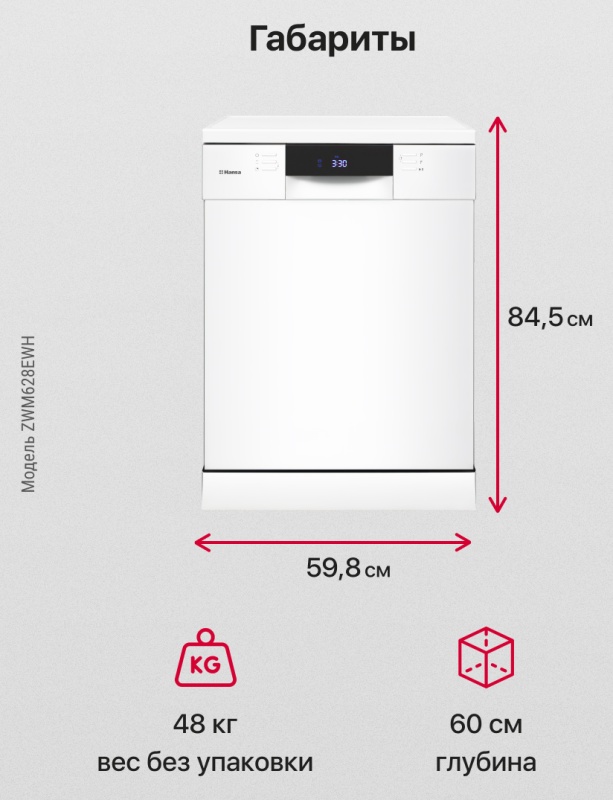 Описаниемашина посудомоечная отдельностоящая, 14 комплектов, 59,8х60х84.5 см, белый