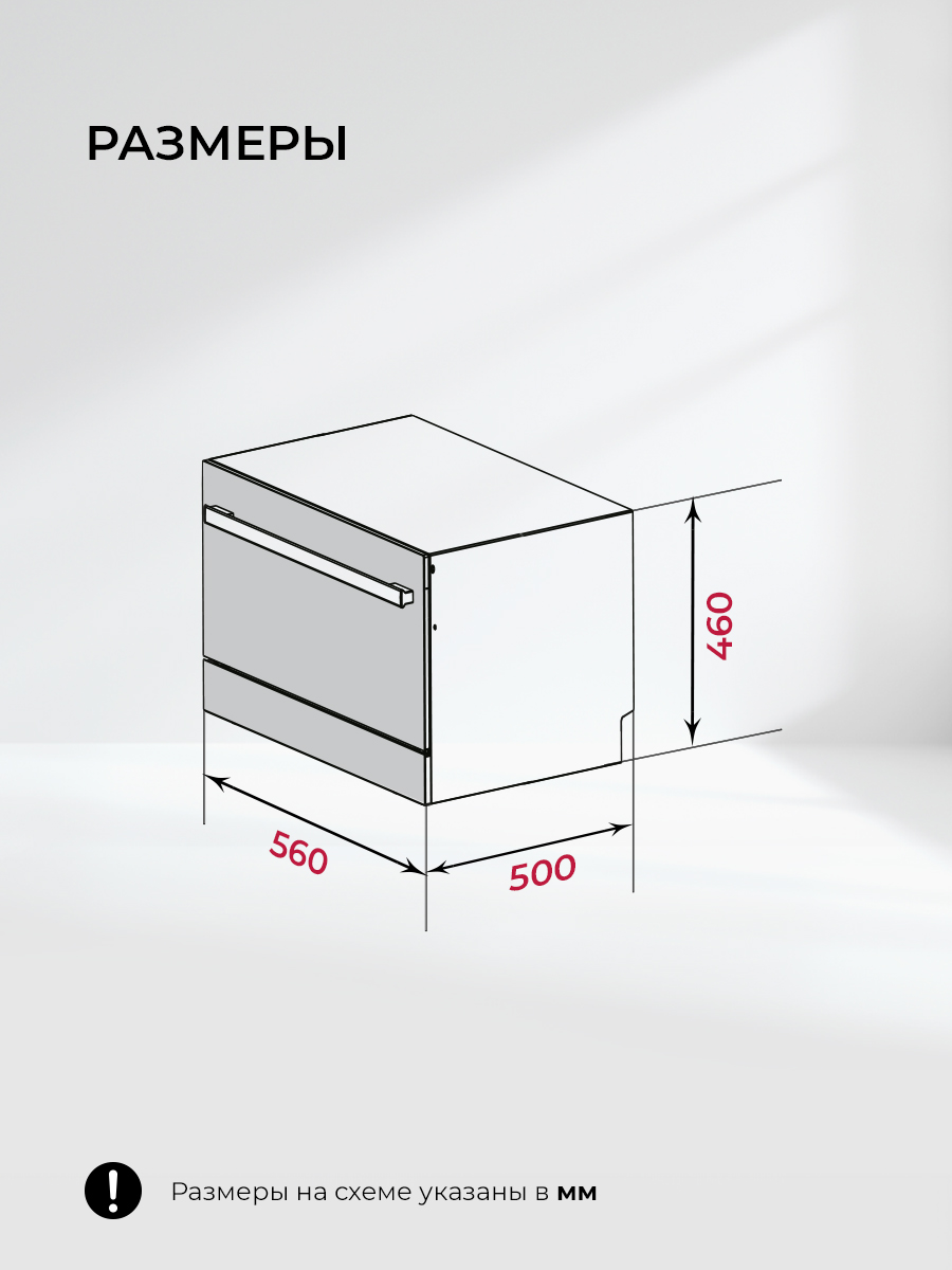 Описаниемашина посудомоечная компактная отдельностоящая, 56 см, 6 комплектов, белое стекло