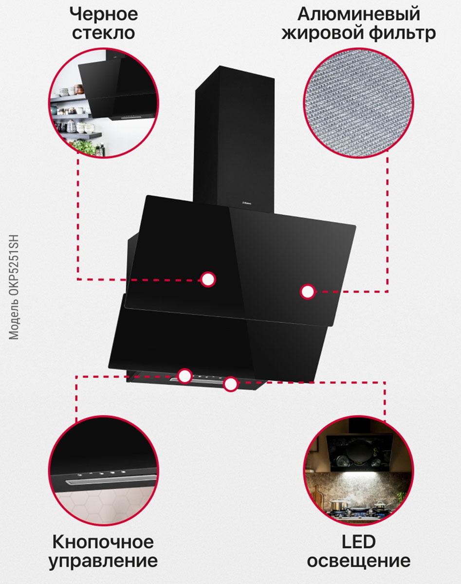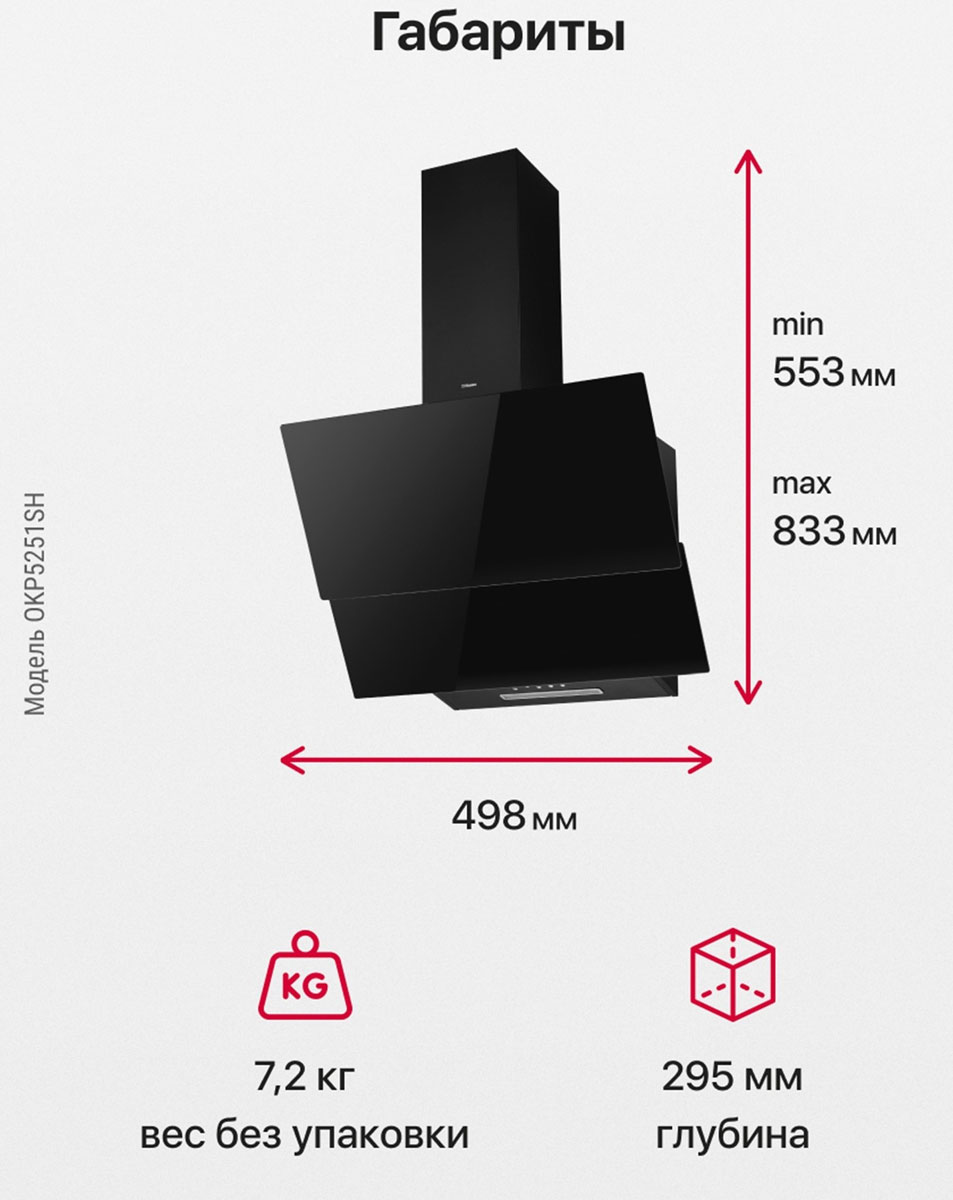 Описаниевытяжка наклонная, 50 см, 650 м3/ч, черный/черное стекло