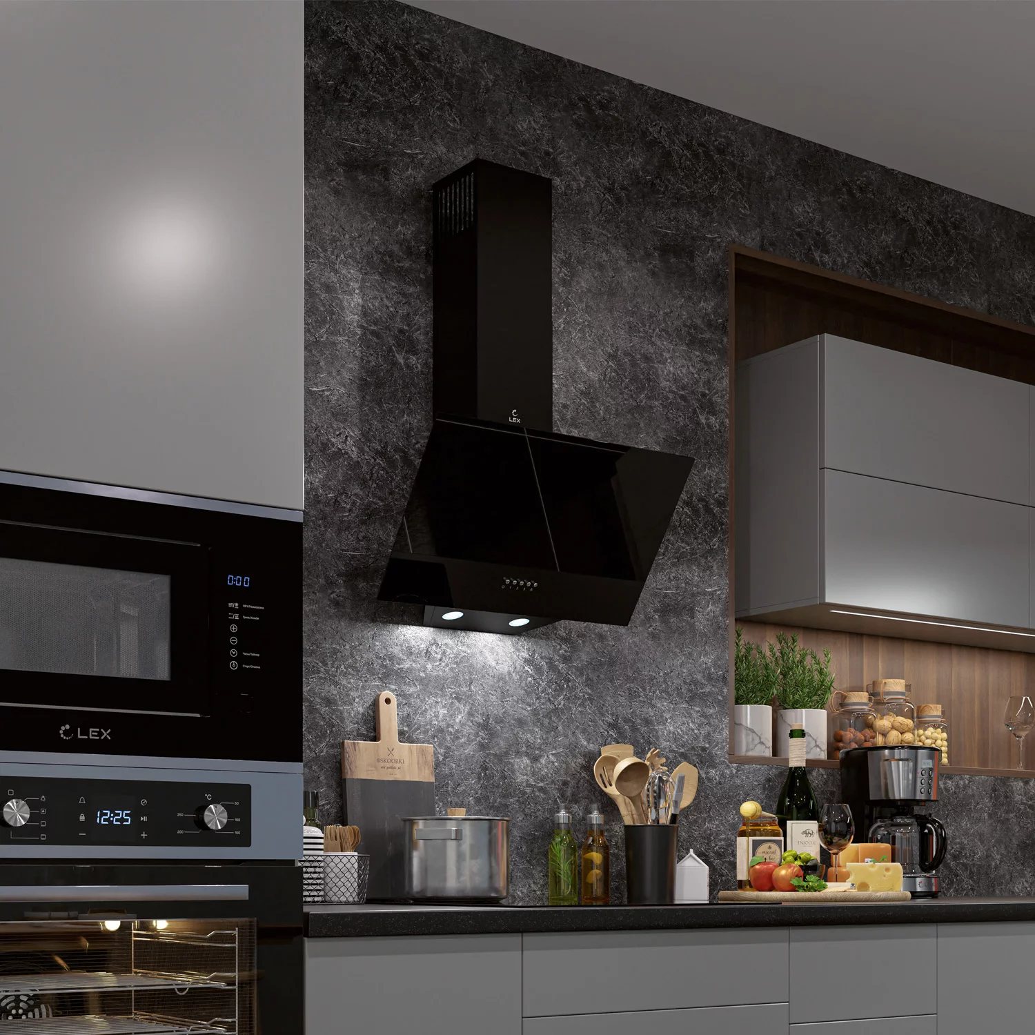 Описаниевытяжка наклонная, 60 см, 700 м3/ч, черное стекло