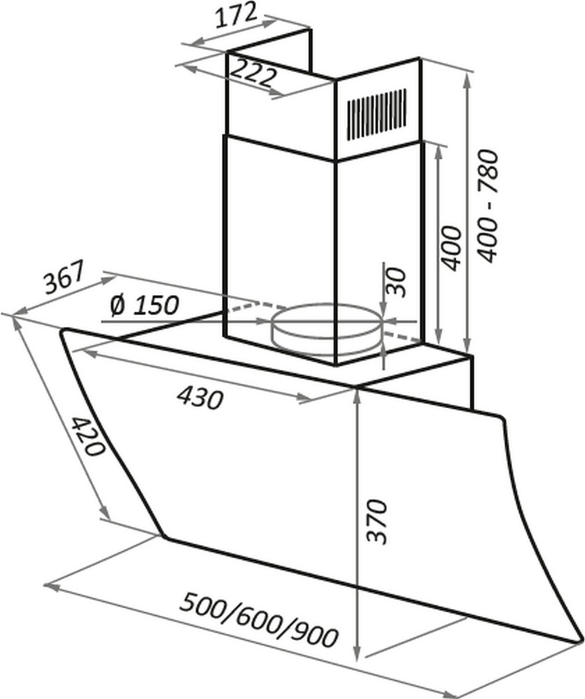 Описаниевытяжка наклонная, 90 см, 1000 м3/ч, черное стекло