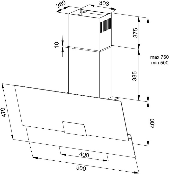 Описаниевытяжка наклонная, 90 см, 550 м3/ч, черное стекло + черная нержавеющая сталь