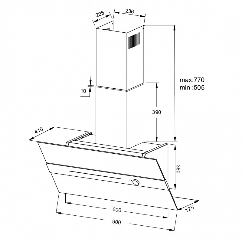 Описаниевытяжка наклонная, 90 см, 950 м3/ч, черное стекло