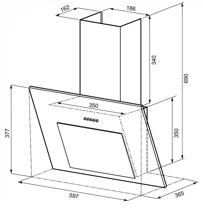 Описаниевытяжка наклонная, 60 см, 650 м3/ч, черное стекло