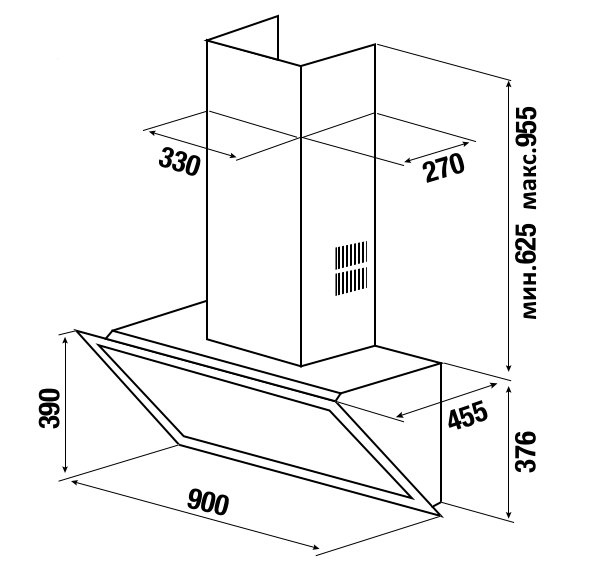 Описаниевытяжка наклонная, 90 см, 920 м3/ч, черное стекло/нержавеющая сталь