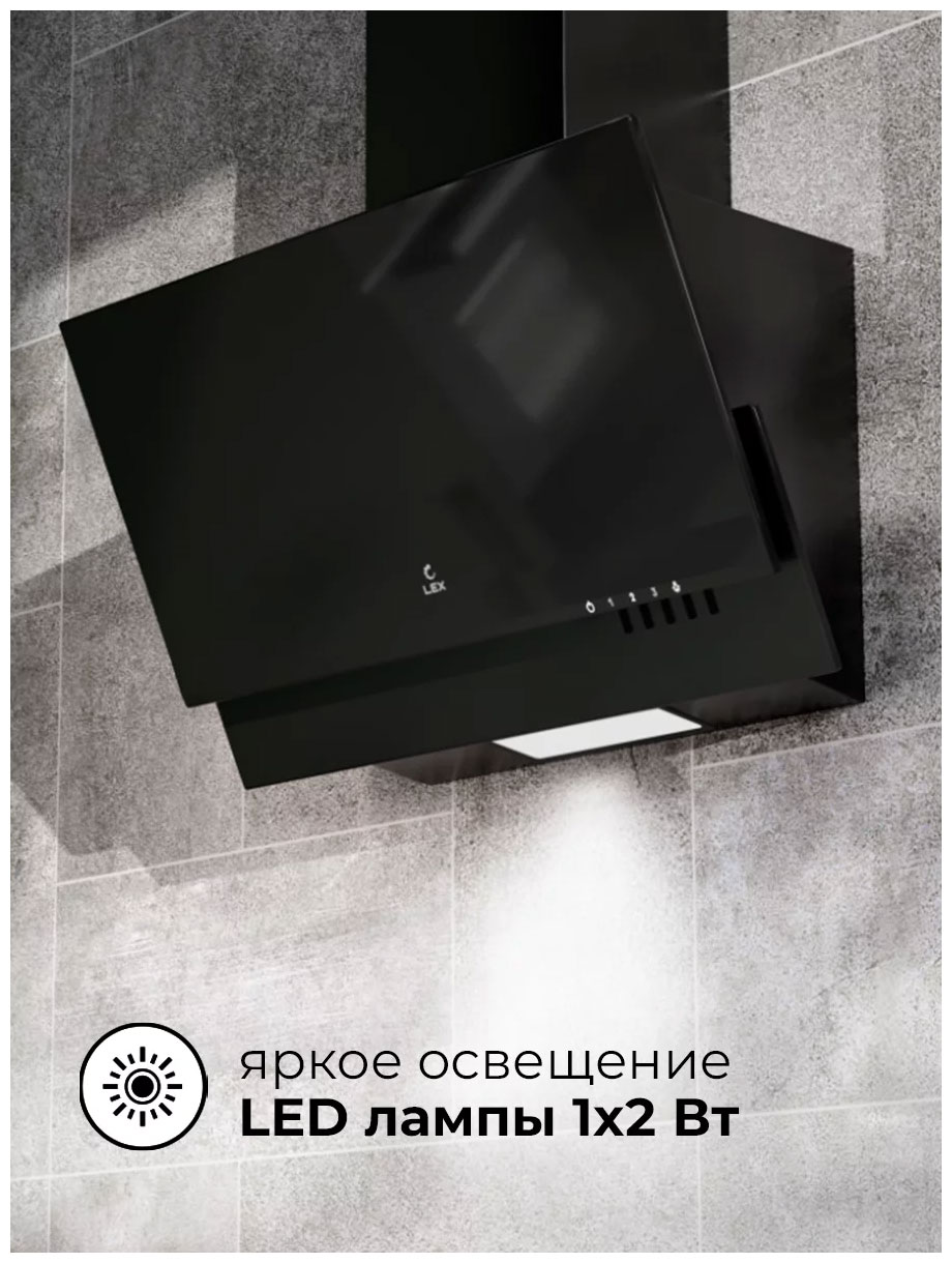 Описаниевытяжка наклонная, 60 см, 650 м3/ч, черное стекло