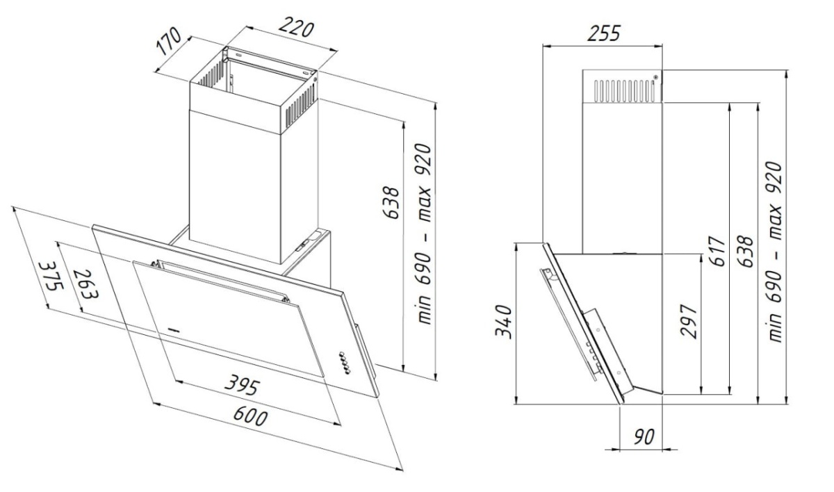 Описаниевытяжка наклонная, 60 см, 870 м3/ч, черный