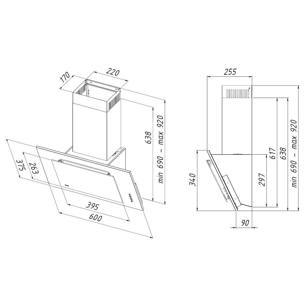 Описаниевытяжка наклонная, 60 см, 740 м3/ч, черный