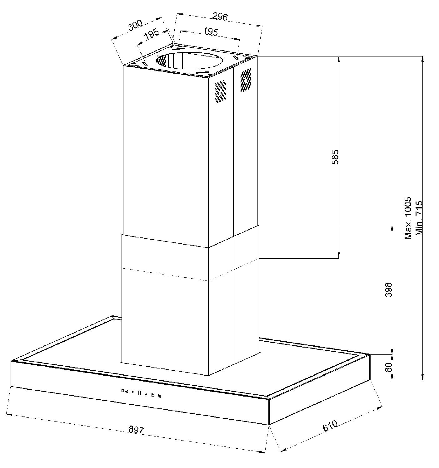 Описаниевытяжка островная, 90 см, 850 м3/ч, черный/панель черное стекло