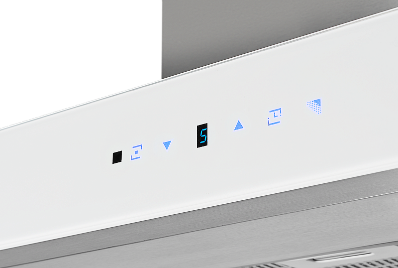 Описаниевытяжка островная, 90 см, 850 м3/ч, нержавеющая сталь/панель белое стекло