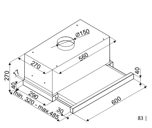 Описаниевытяжка встраиваемая телескопическая, 60 см, 405 м3/ч, черный
