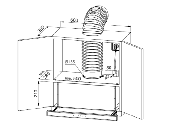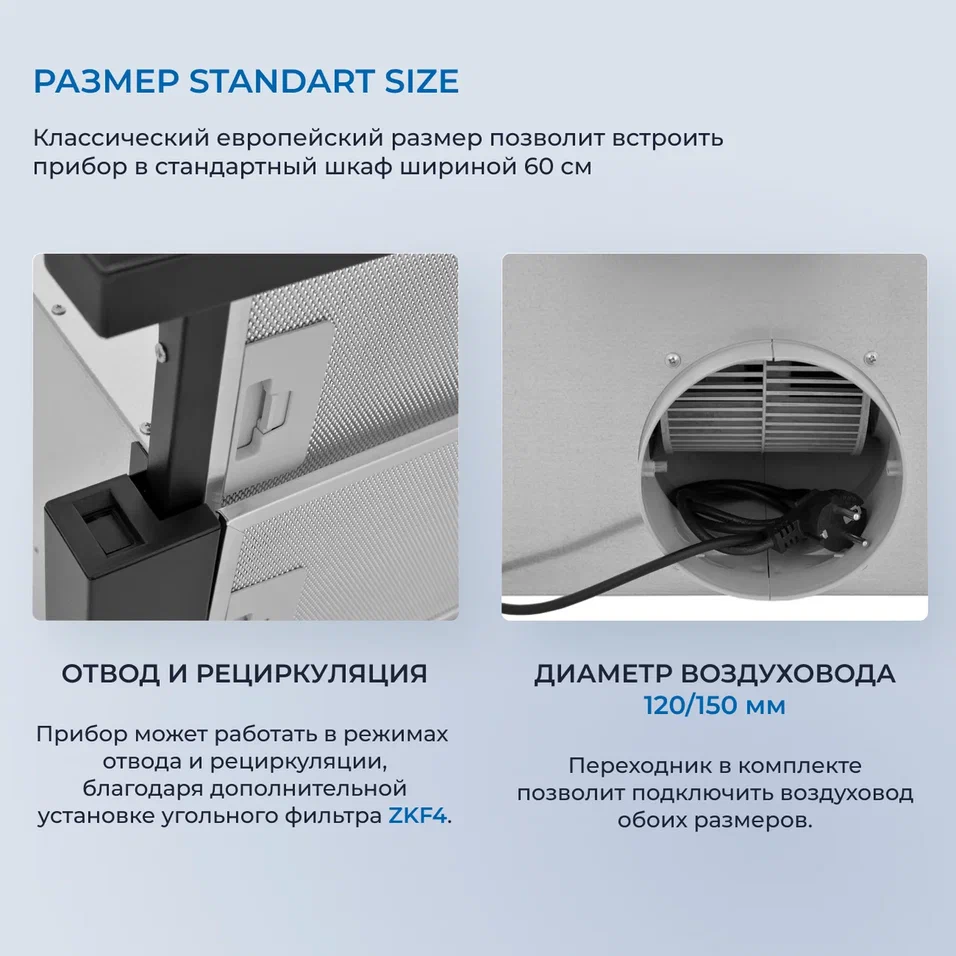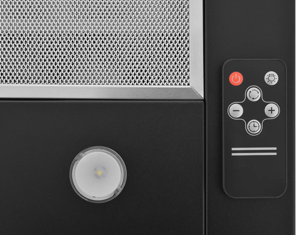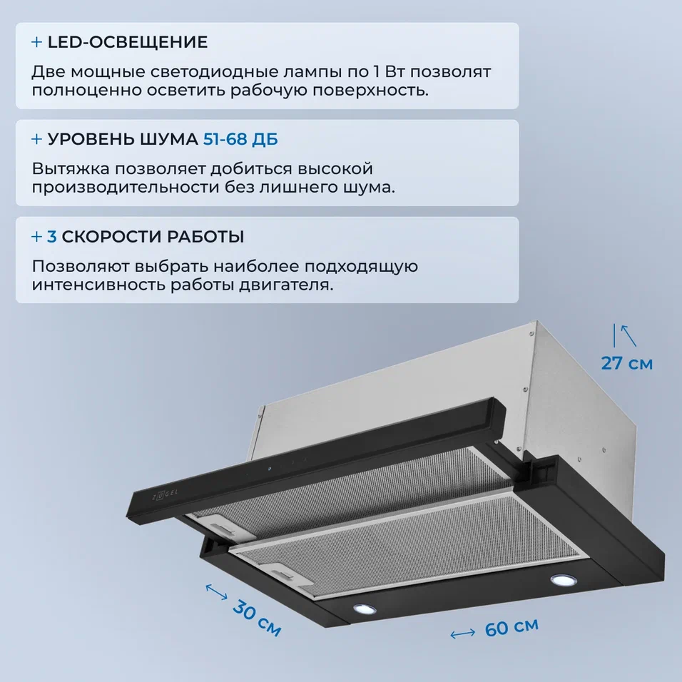Описаниевытяжка встраиваемаятелескопическая, 60 см, 850 м3/час, нержавеющая сталь/передняя панель черное стекло