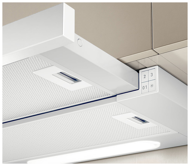 Описаниевытяжка встраиваемая телескопическая, 90 см, 650 м3/ч, белое стекло/нержавеющая сталь