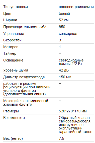 Описаниевытяжка встраиваемая в подвесной шкаф, 52 см, 850 м3/ч, белое стекло