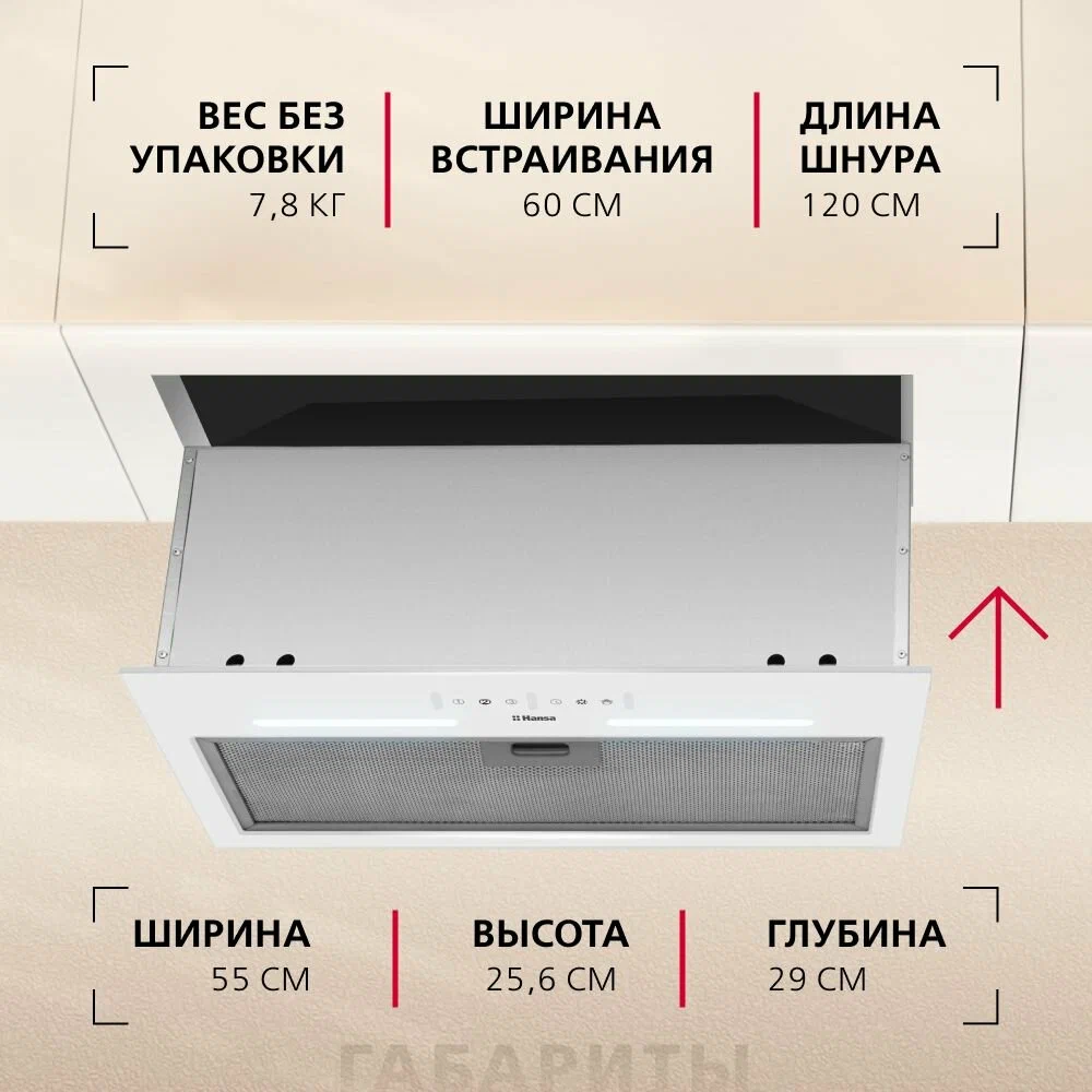 Описаниевытяжка встраиваемая в подвесной шкаф, 55 см, 790 м3/ч, белый