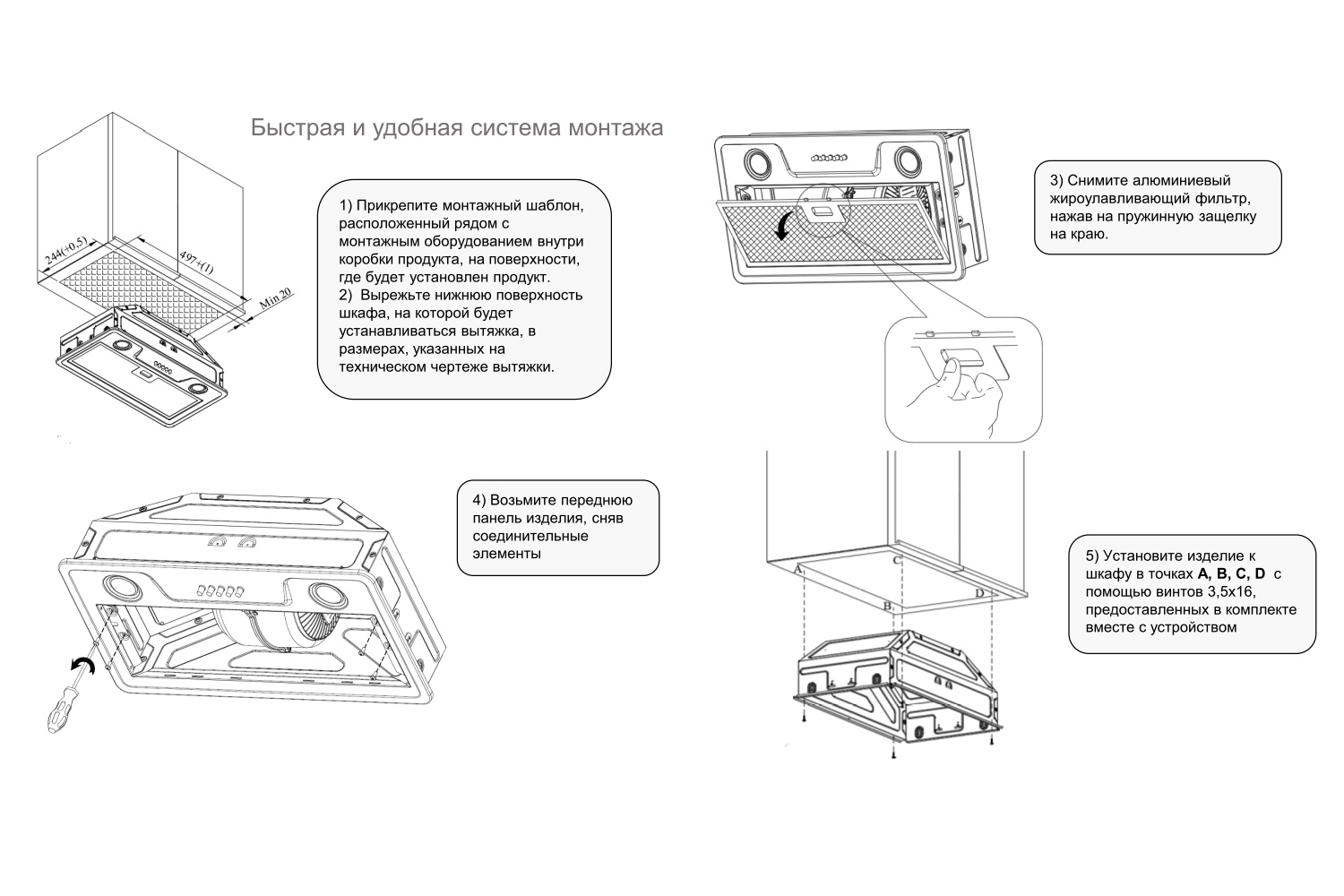 Описаниевытяжка встраиваемая в подвесной шкаф, 52 см, 800 м3/ч, нержавеющая сталь