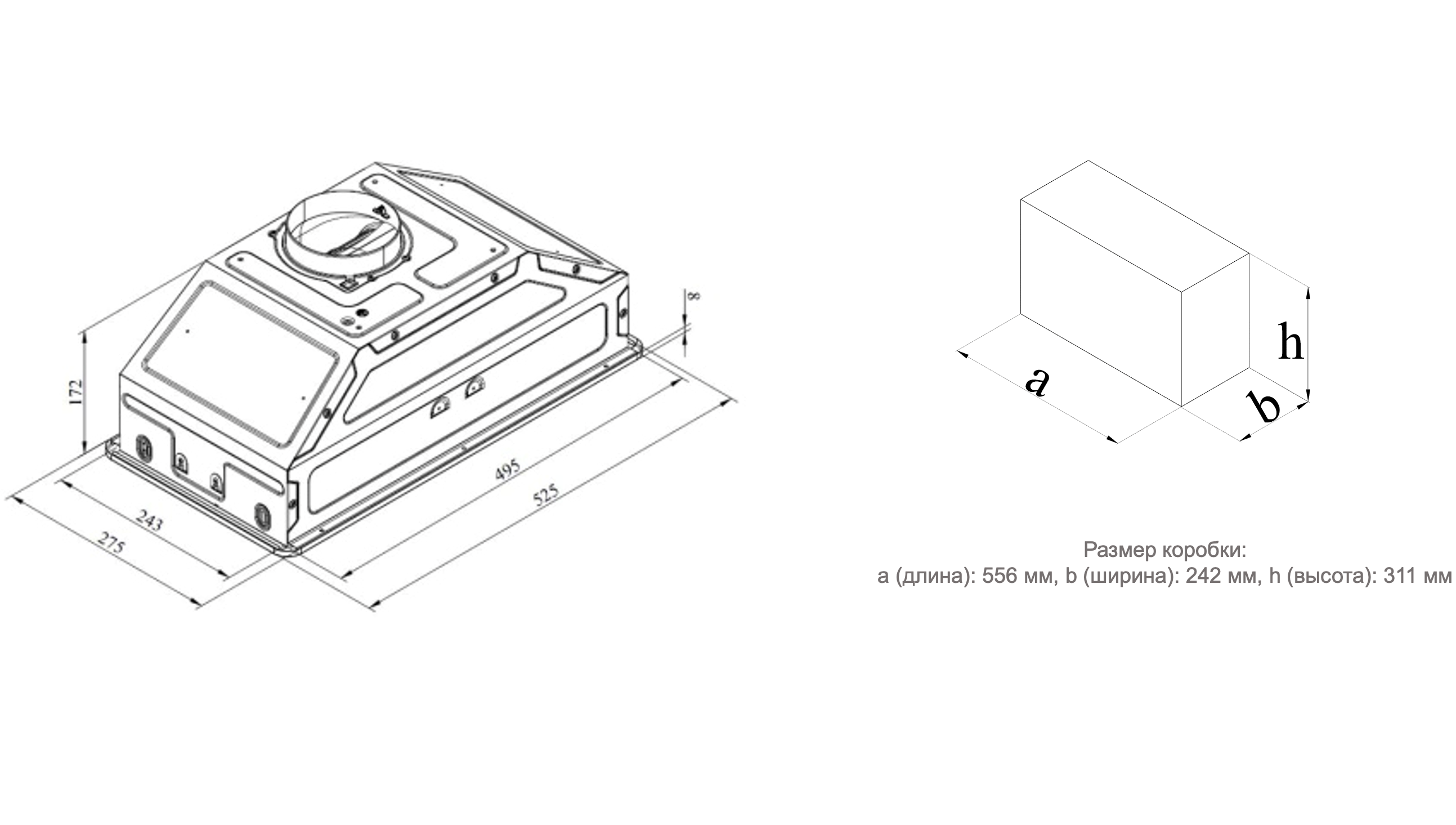 Описаниевытяжка встраиваемая в подвесной шкаф, 52 см, 800 м3/ч, белое стекло