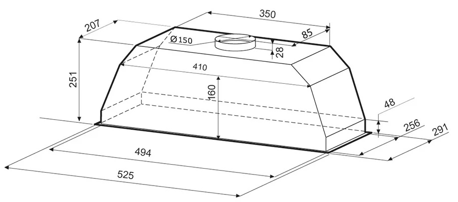 Описаниевытяжка встраиваемая в подвесной шкаф, 52,5 см, 600/ч, черный