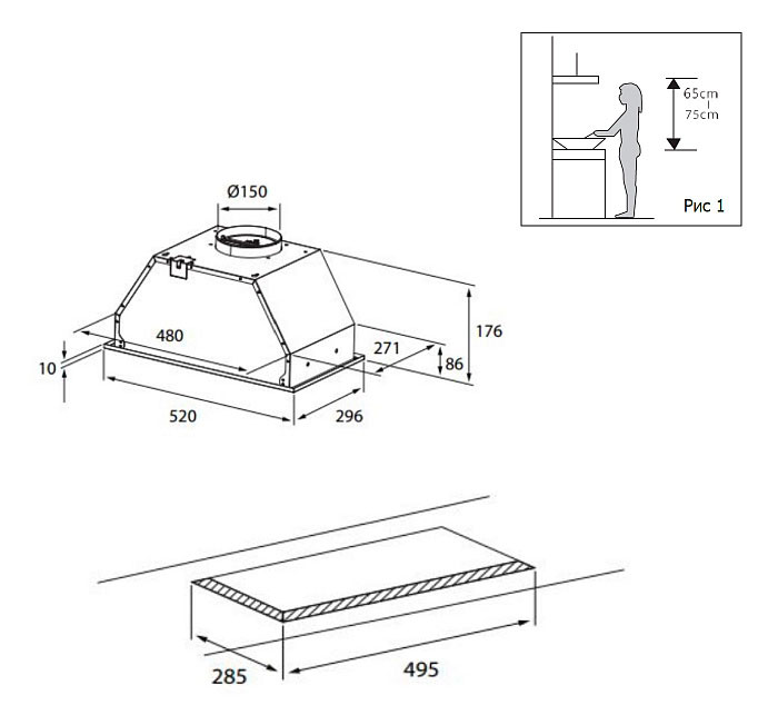 Описаниевытяжка встраиваемая в подвесной шкаф, 53 см, 750 м3/ч, черный