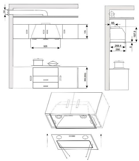 Описаниевытяжка встраиваемая в подвесной шкаф, 52,5 см, 850 м3/ч, черный