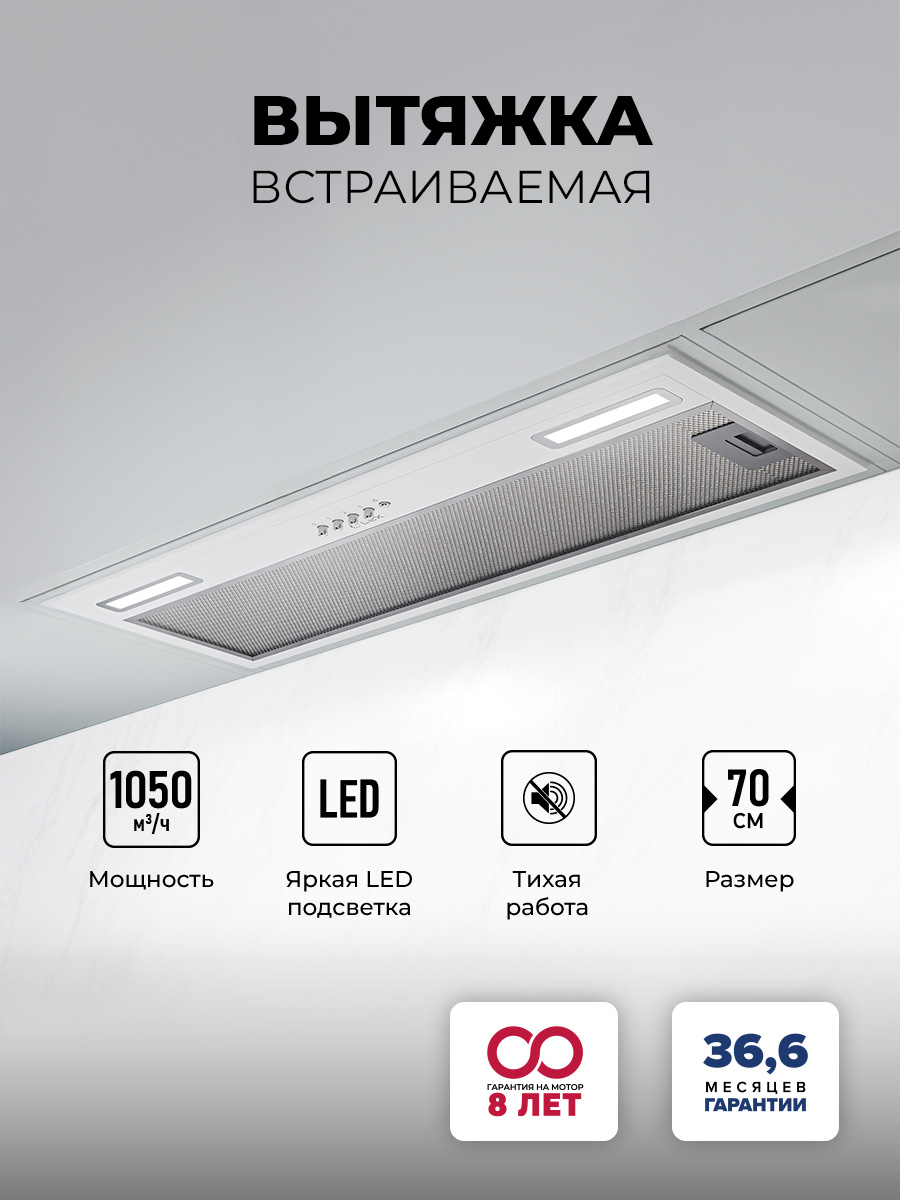 Описаниевытяжка встраиваемая в подвесной шкаф, 70 см, 1050 м3/ч, белый/нержавеющая сталь