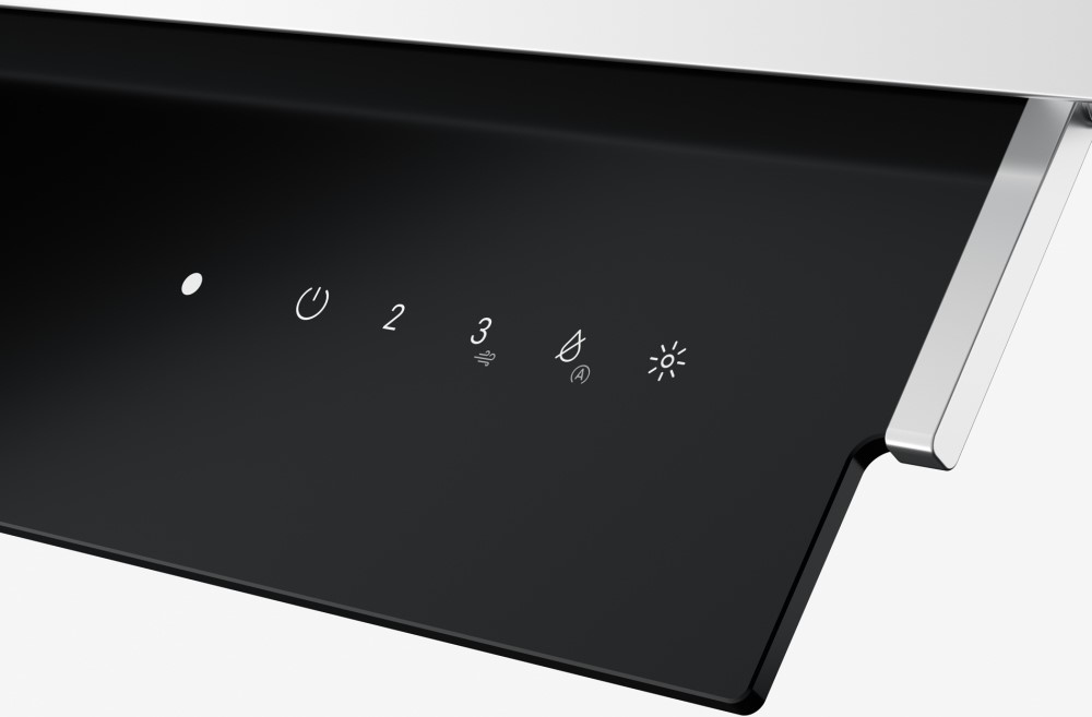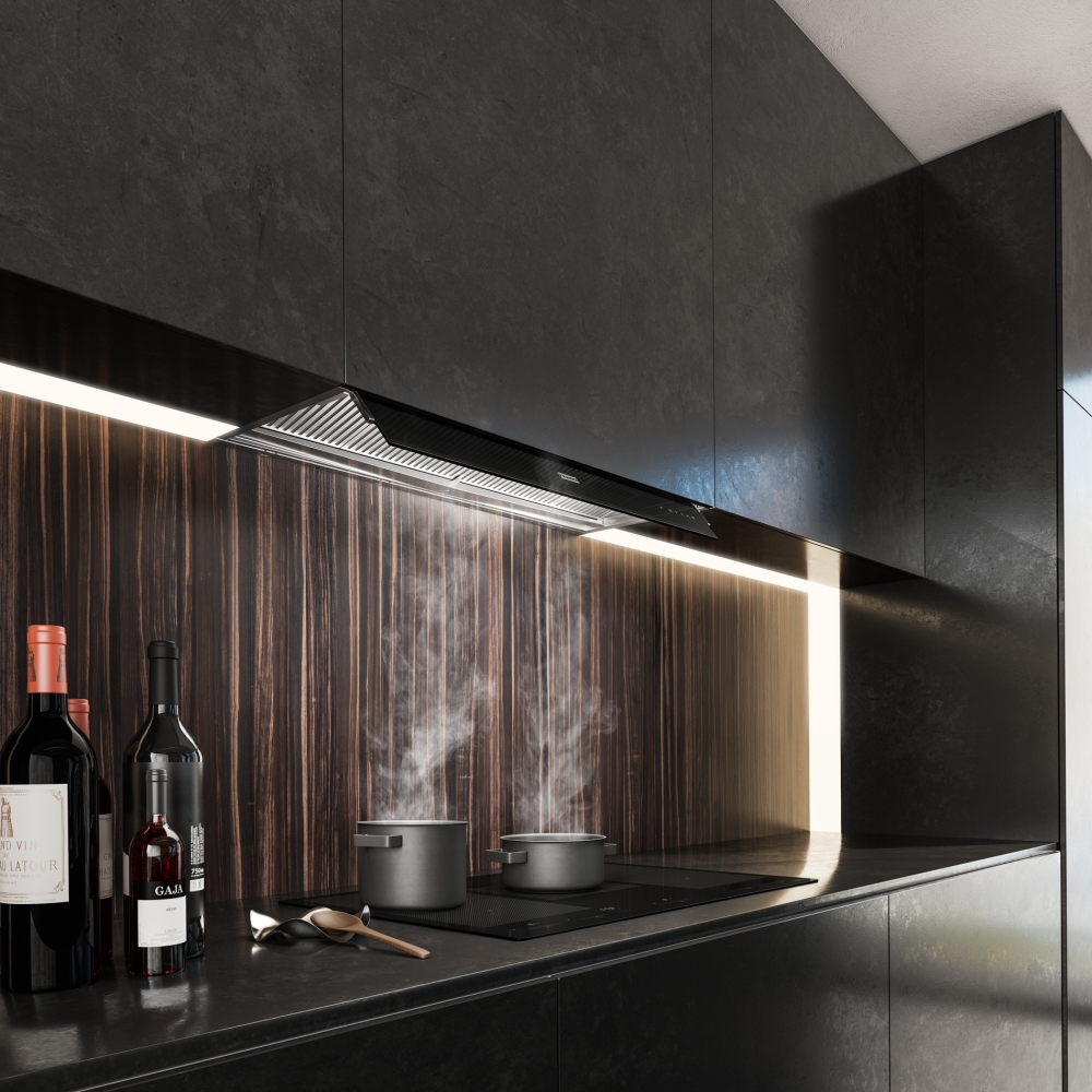 Описаниевытяжка встраиваемая в подвесной шкаф, 90 см, 1050 м3/ч, нержавеющая сталь/черное стекло