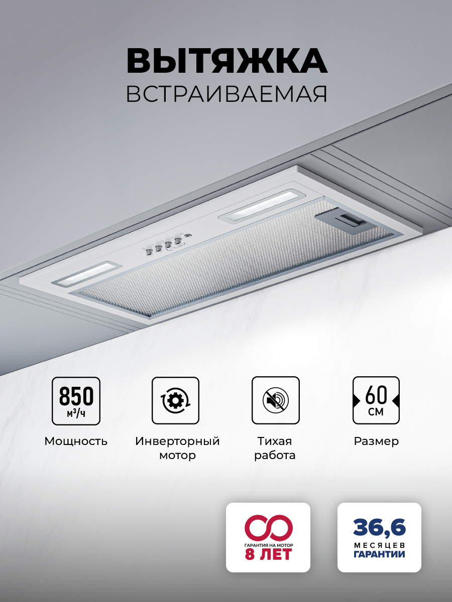 Описаниевытяжка встраиваемая в подвесной шкаф, 60 см, 850 м3/ч, белый/нержавеющая сталь