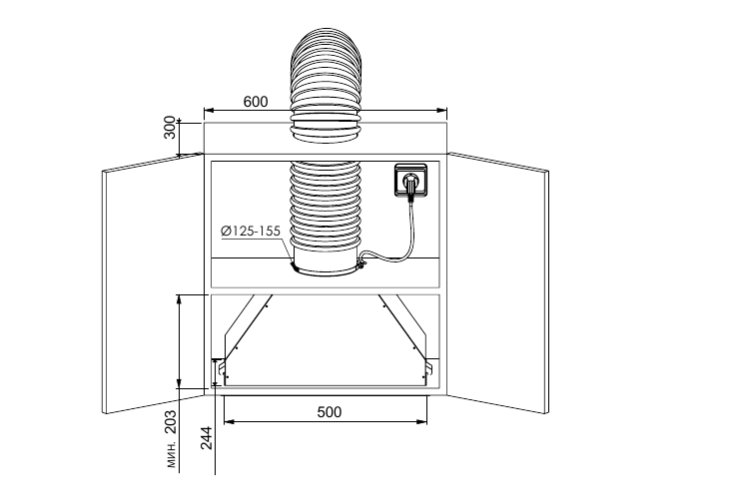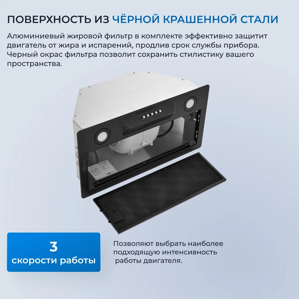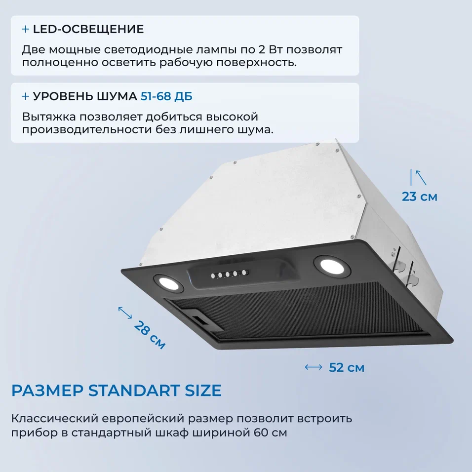 Описаниевытяжка встраиваемая в подвесной шкаф, 52 см, 850 м3/час, черный