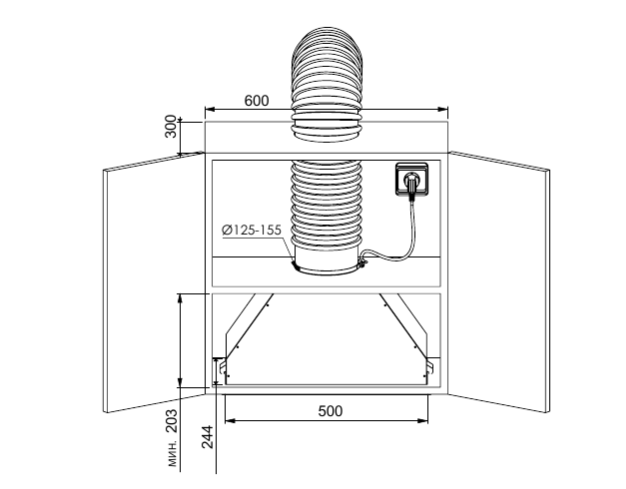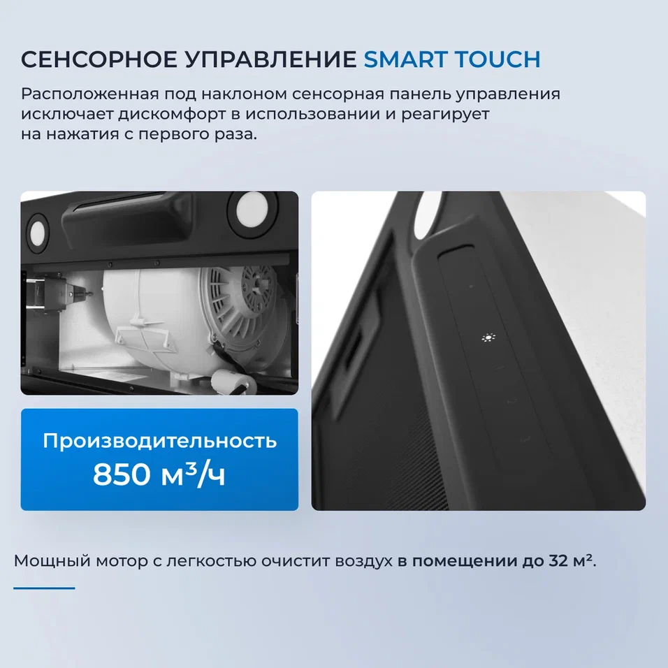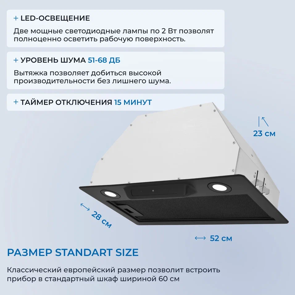 Описаниевытяжка встраиваемая в подвесной шкаф, 52 см, 850 м3/час, черный