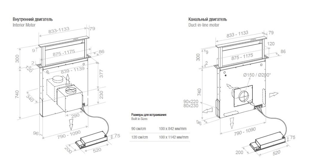 Описаниевытяжка встраиваемая в столешницу, 120 см, 950 м3/ч, черное стекло