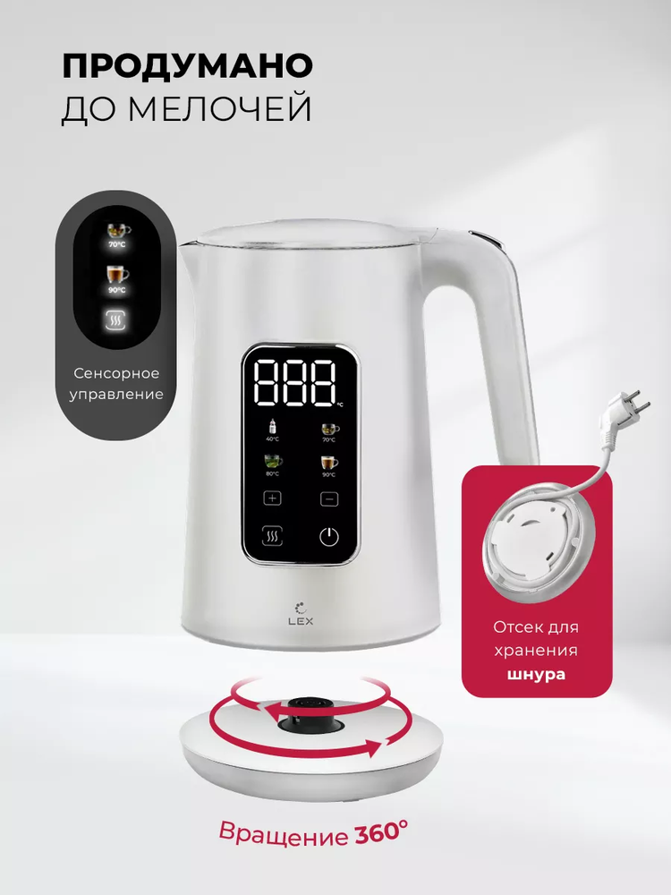 Цвет белый Режимов работы 4 Гарантийный срок (месяцы) 12 Страна производитель Китай Ссылка на сайт производителя https://lex1.ru/shop/melkaya-bytovaya-tehnika/elektricheskie-chayniki/lex-lxk-30026-1 Материал корпуса металл, пластик Мощность, Вт 2200 Терморегулятор есть Автоматическое отключение да Объем 1,7 л - Отзывы
