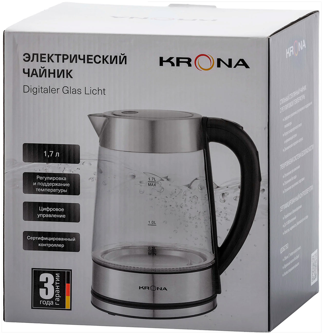 Цвет нержавеющая сталь Режимов работы 5 Гарантийный срок (месяцы) 24 Страна производитель Китай Ссылка на сайт производителя https://krona.ru/catalog/small-household-appliances/electric-kettles/digitaler_glas_licht_1_7l/ Материал корпуса металл, стекло, пластик Мощность, Вт 2200 Терморегулятор есть Автоматическое отключение да Объем 1,7 л - Отзывы