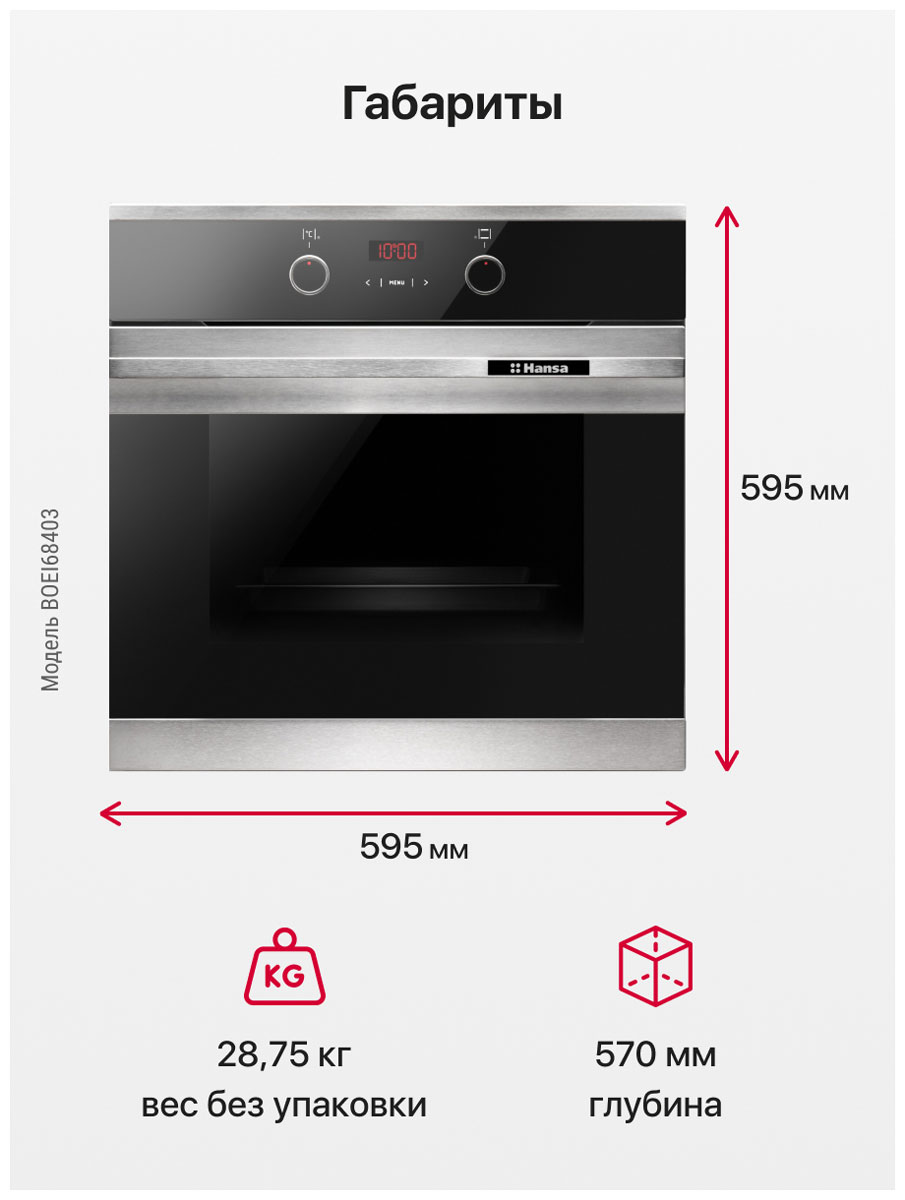 Размер (Высота) 59,5 см Размер (Глубина) 57 см Размер (Ширина) 59,5 см Цвет нержавеющая сталь Класс энергопотребления класс A Ширина прибора 60 см Дисплей есть Конвекция есть Объём духовки 65 л Очистка духовки эмаль легкой очистки Переключатели утапливаемые Режимов работы 8 Количество стекол дверцы духовки три Тип духовки электрическая Установка независимая Телескопические направляющие нет Управление сенсорное + утапливаемые ручки Таймер есть Функции нет Приготовление с помощью пара нет Термозонд (Термощуп) нет Защита от детей нет Мощность подключения, Вт 2900 Плавное закрытие дверцы духовки нет Фронтальная поверхность закалённое стекло Фурнитура нержавеющая сталь Гарантийный срок (месяцы) 12 Страна производитель Польша Ссылка на сайт производителя https://www.hansa.ru/catalog/duchovki/boei68403/?ysclid=ldisyp90k1512380696 Размер в упаковке (Высота) 66 см Размер в упаковке (Ширина) 67 см Размер в упаковке (Глубина) 70 см Вес прибора 28,75 кг Размер (Ширина), см 59,5 Размер (Высота), см (Общие) 59,5 Размер (Глубина), см 57 - Отзывы