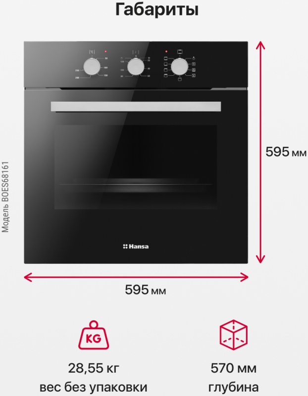 Размер (Высота) 59,5 см Размер (Глубина) 57,5 см Размер (Ширина) 59,5 см Цвет черный Класс энергопотребления класс A Ширина прибора 60 см Дисплей нет Конвекция есть Объём духовки 62 л Очистка духовки паром Переключатели поворотные Режимов работы 8 Количество стекол дверцы духовки три Тип духовки электрическая Установка независимая Телескопические направляющие нет Управление механическое Таймер есть Функции нет Приготовление с помощью пара нет Термозонд (Термощуп) нет Защита от детей нет Мощность подключения, Вт 2900 Плавное закрытие дверцы духовки нет Фронтальная поверхность закалённое стекло Фурнитура нержавеющая сталь Гарантийный срок (месяцы) 12 Страна производитель Польша Ссылка на сайт производителя https://hansa.ru/product/duhovoy-shkaf-hansa-boes68161 Размер в упаковке (Высота) 66 см Размер в упаковке (Ширина) 67 см Размер в упаковке (Глубина) 70 см Вес прибора 28,55 кг Размер (Ширина), см 59,5 Размер (Высота), см (Общие) 59,5 Размер (Глубина), см 57,5 - Отзывы