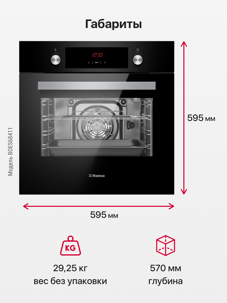 Размер (Высота) 59,5 см Размер (Глубина) 57,5 см Размер (Ширина) 60 см Цвет черный Класс энергопотребления класс A Ширина прибора 60 см Дисплей есть Конвекция есть Объём духовки 65 л Очистка духовки паром Переключатели поворотные Режимов работы 8 Количество стекол дверцы духовки три Тип духовки электрическая Установка независимая Телескопические направляющие нет Управление утапливаемые переключатели Таймер есть Функции нет Приготовление с помощью пара нет Термозонд (Термощуп) нет Защита от детей нет Мощность подключения, Вт 2900 Плавное закрытие дверцы духовки нет Фронтальная поверхность металл и стекло Фурнитура нержавеющая сталь Гарантийный срок (месяцы) 12 Страна производитель Польша Ссылка на сайт производителя https://hansa.ru/product/duhovoy-shkaf-hansa-boes68411-chernyy Размер в упаковке (Высота) 66 см Размер в упаковке (Ширина) 67 см Размер в упаковке (Глубина) 70 см Вес прибора 29,25 кг Размер (Ширина), см 60 Размер (Высота), см (Общие) 59,5 Размер (Глубина), см 57,5 - Отзывы