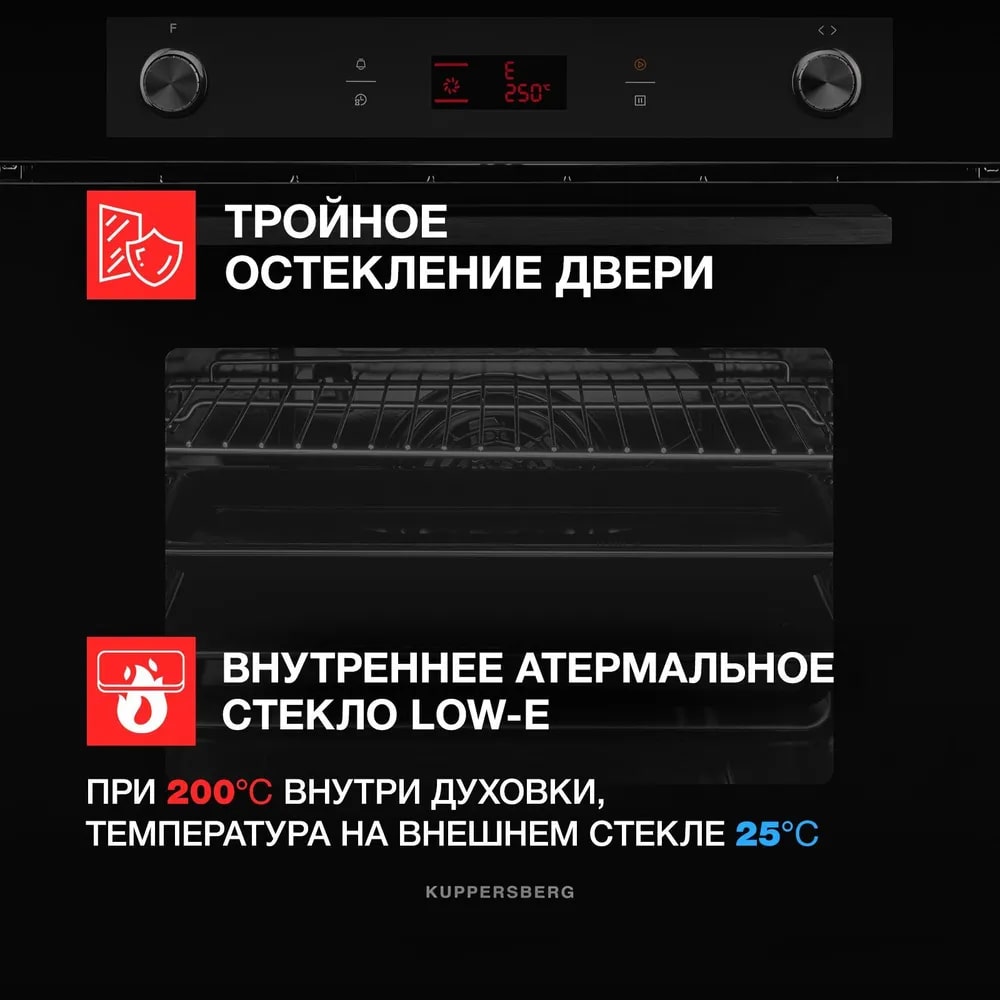 Размер (Высота) 59,5 см Размер (Глубина) 57,5 см Размер (Ширина) 59,5 см Цвет черный Класс энергопотребления класс A Ширина прибора 60 см Дисплей есть Конвекция есть Объём духовки 70 л Очистка духовки эмаль легкой очистки Переключатели поворотные Режимов работы 9 Количество стекол дверцы духовки три Тип духовки электрическая Установка независимая Телескопические направляющие есть Управление электронное Таймер нет Функции нет Приготовление с помощью пара нет Термозонд (Термощуп) нет Защита от детей есть Мощность подключения, Вт 3000 Фронтальная поверхность закалённое стекло Фурнитура черная Гарантийный срок (месяцы) 24 Страна производитель Китай Ссылка на сайт производителя https://kuppersberg.ru/products/hm_629_black/?ysclid=mlkvy05np4156250800 Размер в упаковке (Высота) 68,8 см Размер в упаковке (Ширина) 67 см Размер в упаковке (Глубина) 62,1 см Вес прибора 32 кг Размер (Ширина), см 59,5 Размер (Высота), см (Общие) 59,5 Размер (Глубина), см 57,5 - Отзывы